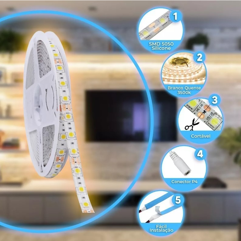 Fita Led 3528 Rolo 5 Metros 300 Leds Silicone Com Fonte Ip65 Prova Dágua Bivolt Branco Frio/Branco Quente