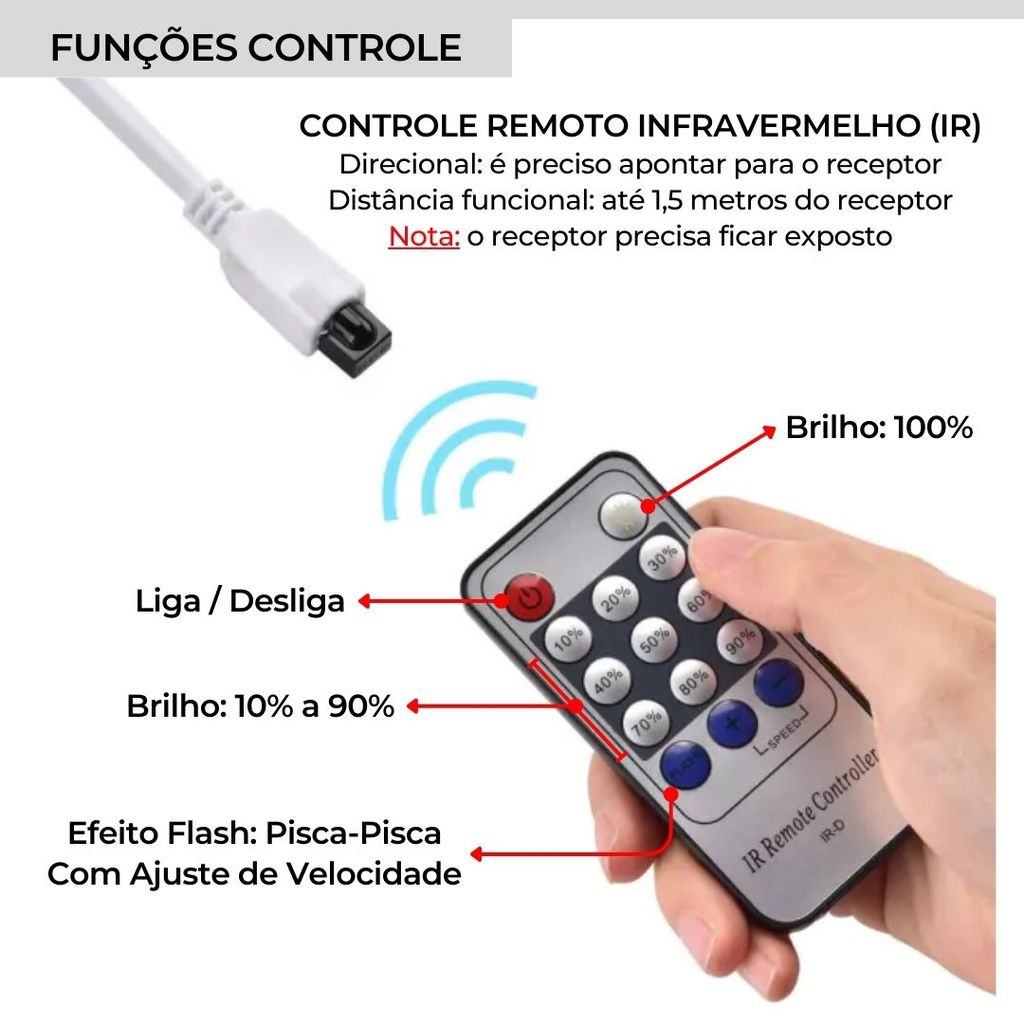 ✨ Fita LED 5 Metros 300 LEDs 12V com Controle Dimmer e Fonte ✨ A fita de LED é a solução ideal para quem busca uma iluminação decorativa moderna, funcional e econômica. Fácil instalação e controle remoto com ajuste de brilho, ela transforma qualquer ambiente com conforto visual e sofisticação. 🔥 Principais Benefícios 📏 Rolo com 5 metros – pode ser cortada no tamanho desejado 📦 Kit completo – fita de LED + controle + fonte bivolt 🛠️ Fita adesiva dupla face – instalação rápida e prática 🏠 Ideal para ambientes internos e decoração moderna 💰 Baixo consumo de energia e longa vida útil ________________________________________ ⚙️ Especificações: Fita de LED • Tipo de LED: SMD-3528 (Alto Brilho) • Quantidade de LEDs: 300 LEDs (60 por metro) • Comprimento: 5 metros • Largura da fita: 8mm • Voltagem: DC-12V • Potencia: 4,8 Watts por metro • Proteção: IP20 (sem silicone – uso interno) • Fixação: Fita adesiva dupla face já inclusa • Ângulo de iluminação: 120° • IRC: >90 ________________________________________ 📦 O Que Vou Receber? 📌 01 Fita LED SMD-3528 – Rolo com 5 metros (selecionar a cor do LED no ato da compra) 📌 01 Fonte 12V-2A Bivolt (110v-220v) 📌 01 Controle Remoto Com Controlador Dimmer IR ________________________________________ 💡Qual cor escolher? • Branco Quente (2800K-3000K): Traz aconchego e sofisticação. Ideal para quartos, salas de estar e áreas de relaxamento. • Branco Neutro (4000K): A cor "do dia". Perfeita para maquiagem e ambientes que precisam de luz natural e fiel às cores. • Branco Frio (6000K-6500K): Ideal para áreas de trabalho, cozinhas e escritórios. Passa sensação de limpeza e foco. ________________________________________ ❓ Perguntas Frequentes (FAQ) 1. Posso cortar a fita LED? Sim! Ela pode ser cortada nos pontos indicados na própria fita. 2. Dá para ajustar o brilho? Sim, o controle remoto permite ajuste de 10% a 100%. 3. A fonte já vem inclusa? Sim, acompanha fonte bivolt pronta para uso. ⚠️ Não ligar a fita de LED direto na tomada – utilizar fonte 12V compatível. 4. Pode ser usada em móveis e painéis de TV? Sim, é ideal para móveis, cabeceiras, espelhos e painéis. 5. É resistente à água? Não. Este modelo é IP20, ou seja, não é resistente à água. Ideal para decoração de quarto, cabeceiras, painéis de TV, espelhos e móveis.