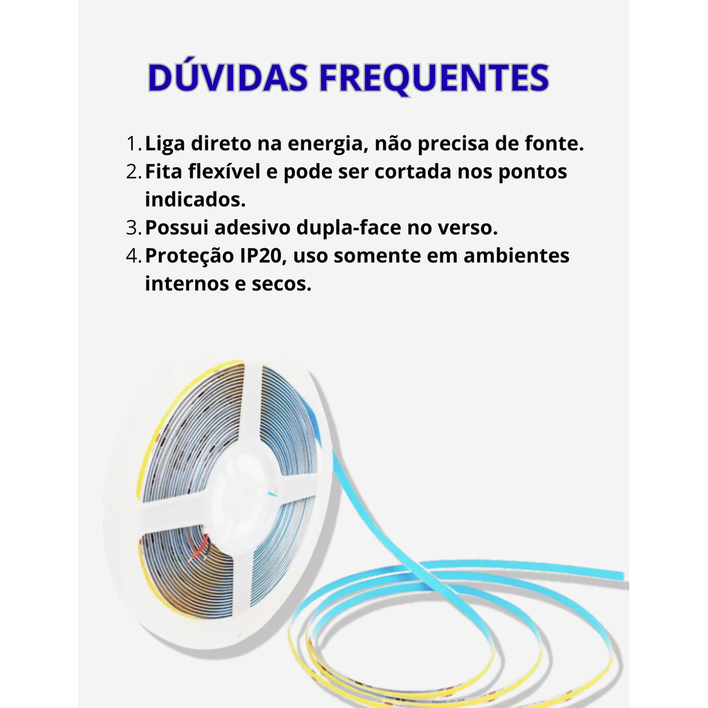 ATENÇÃO Fotos ilustrativas. Antes de finalizar a compra, verifique se escolheu a variação cor e quantidade que deseja. ORIENTAÇÕES DE USO PARA FITAS EM GERAL: 1- Verifique a compatibilidade do produto com seus equipamentos para que não existam problemas na hora do uso. 2 - Não nos responsabilizamos pelo mau uso do produto. 3 - Para produtos que necessitam instalação, a mesma deve ser feita por um profissional capacitado, não nos responsabilizamos por uso indevido ou instalação incorreta. 4- Realize o teste de funcionamento antes de qualquer tipo de instalação, corte, remoção de duplaface ou emenda. Ao fazer adaptação no produto perde-se a garantia. CARACTERÍSTICAS Modelo: 2835 288 COB Potência: 10W/m - 100W rolo Lumens: Cerca de 800 a 120 Lumens (Por metro) Voltagem: DC 110V Temperatura da cor: 3000K (branco quente) 4000k (neutro) - selecionar cor de acordo com a disponibilidade do anúncio. Grau de Proteção: IP20 (não é a prova d'água) Quantidade de Leds: 288 Leds/Por Metro Angulo: 160º Fixação: Adesivo dupla face RA: 80 Tipo de led: COB DIMENSÃO Comprimento: 8MM x 10 Metros Observações: Seguir as orientações de uso. ITENS INCLUSOS 1 Rolo Fita Led Cob 50m 8mm 288 ECONOMIZE ATÉ 90% DE ENERGIA - As Fitas LED são Flexíveis - Baixo consumo de energia É Longa vida útil. - Devido às suas Dimensões as Fitas LED - se Ajustam Bem a Qualquer Projeto, - Além da Possibilidade de ser cortada . - De fácil instalação e fixação, - As Fitas LED valorizam o trabalho de Arquitetos, - Decoradores e Lighting Designers. ATENÇÃO Não Pode Ser Usadas Em Piscinas RISCO DE CHOQUE, Pois por ser tratar de um produto 220v 110V
