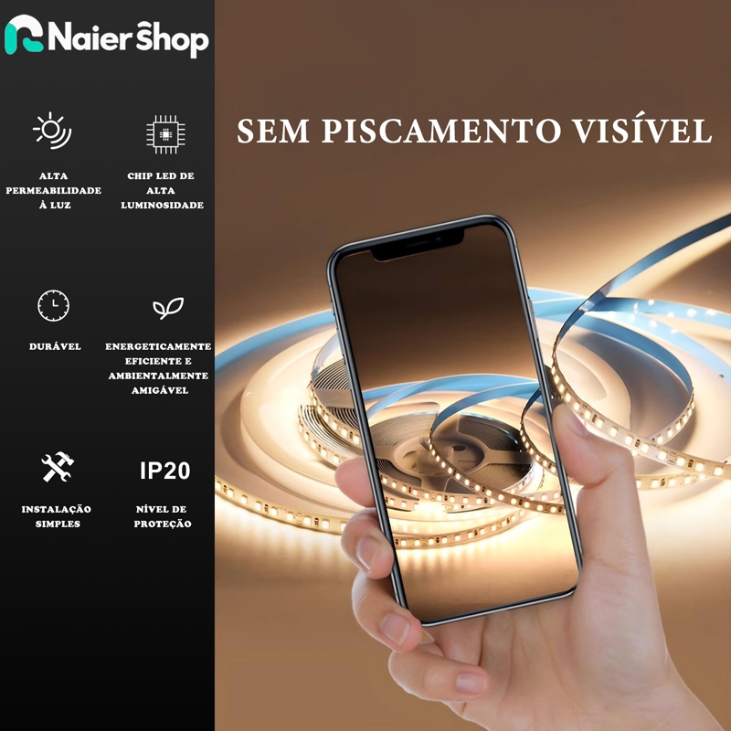 A iluminação com fita de LED é sutil, muito versátil e moderna, ela é tendência criativa para iluminar sancas de gesso, armario, cabeceira, vitrine, espelho etc. Características Técnicas - Acompanha fonte: Sim - Tipo de LED: 3528 - Potência por metro: 15W - Quantidade de LEDS: 1200 Leds - Quantidade de LEDS por Metro: 240 Leds - Voltagem: 12V - Cor da Luz: 6.400-6.700K/4.000K/2.700-3.000K - Metragem: 5 metros - Ângulo de iluminação: 120º - Dimensão: 5 metros x 10cm (Comprimento X Largura) - Tempo de Acendimento: Imediato - Proteção: IP20 - Baixíssimo consumo: (até 95% de economia) - Cor viva e de alto brilho - Duvidas frequentes Posso recortar a fita em metragem menor? Resposta: Sim , você pode cortar a fita a cada 5 centímetros (respeitando a marcação). Como é feita a conexão da fita com a fonte? Resposta: a fita é conectada via plug macho e plug femea (bem facil). Pode ser ligado em tensão 127 e 220V? Resposta: a fita opera em tensão 12V e deve ser ligada apenas na fonte, a fonte pode ser ligada em tensão AC100-240V. Consigo ligar a fita led em uma bateria de carro? Resposta: Sim, pois ela opera em 12V. Garantia do vendedor: 30 dias