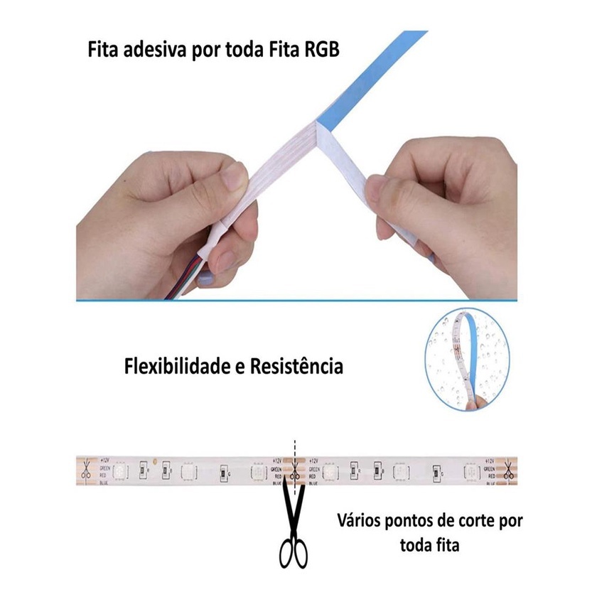 🛒 Fita LED RGB 3528 com 5 Metros + Controle Remoto (FONTE NÃO INCLUSA) 🛒 ✅ CORES DO PRODUTO: R - Vermelho (Red) G - Verde (Green) B - Azul (Blue) W- Colorido ✅ MODOS: FLASH- As cores mudam rapidamente (Apenas cores sólidas) STROBE- As cores mudam de forma lenta e mais coloridas SMOOTH- As cores mudam rapidamenda (Modo colorido) ✅ESPECIFICAÇÕES: FONTE NÃO INCLUSA - Consumo: 4,7 W por metro. - Tensão da Fita: 12 Volts - Cor da Luz: RGB - Luminosidade: 446 Lumens por metro, com variação de 10% - Ângulo de iluminação: 120 - Índice de proteção: IP20 - Vida útil: 40.000 horas - Peso: 180 Gramas ✅ ITENS INCLUSOS 1 Fita de LED 1 Controle (TIRAR O PLÁSTICO DE PROTEÇÃO) 1 Controlador