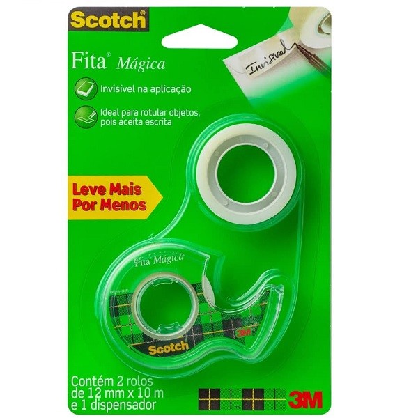 FÁCIL DE USAR. A Fita Mágica da Scotch é super fácil e prática de manusear, tem desenrolamento suave e corta facilmente. NÃO AMARELA. Aceita escrita de lápis e caneta e não amarela com o tempo. NÃO APARECE. A Fita Mágica pode ser usada em fotocópias ou scanners, repara documentos, identifica objetos e faz emendas em papel. ACEITA BAIXAS TEMPERATURAS. A fita aceita escrita e pode ser utilizada para etiquetar alimentos, mesmo que eles sejam refrigerados, pois a fita suporta baixas temperaturas. CONTÉM. Contém 2 rolos de 12mm x 10m e 1 dispensador.