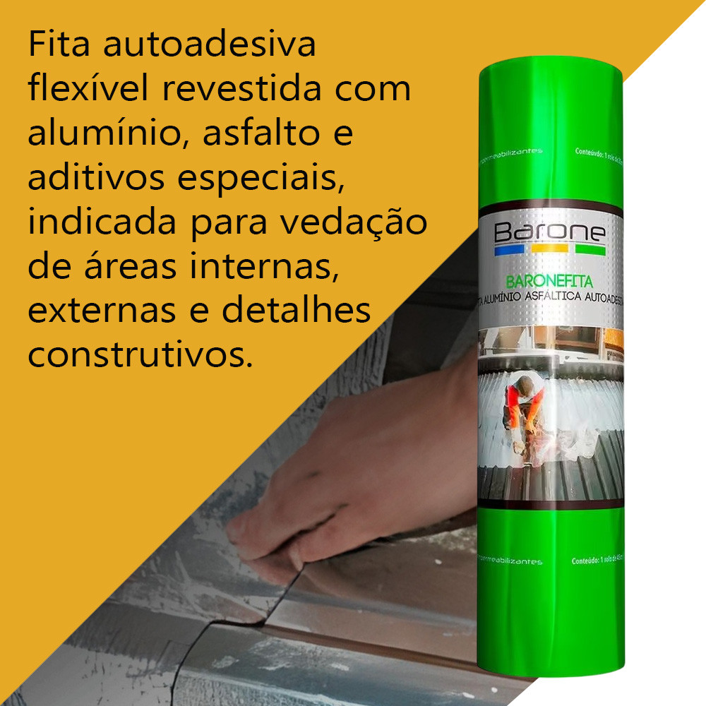 Fita autoadesiva flexível revestida com alumínio, asfalto e aditivos especiais, indicada para vedação de áreas internas, externas e detalhes construtivos. Fácil aplicação; Alta aderência em diversas superfícies; Elevada durabilidade; Utilizada para controle de temperatura; Produto Atóxico Áreas de Aplicação: - Telhados, pingadeiras, rufos e calhas; - Dutos de ventilação e ar condicionado; - Áreas expostas sem proteção mecânica; ATENÇÃO: Variações de temperatura e umidade em obra podem afetar as propriedades finais do produto. Informações Técnicas: Tamanho: 90cm X 10 Mts Espessura: 0,6mm Cor: Prata Resistência à Tração Longitudinal: 120N Alongamento Longitudinal: 15% Absorção de Água: <1,0% Flexibilidade a Baixa Temperatura: - 10°C Flexibilidade a baixa temperatura após envelhecimento: 0°C Resistência ao destacamento: > 80N/m VALIDADE: 12 Meses com embalagem fechada.