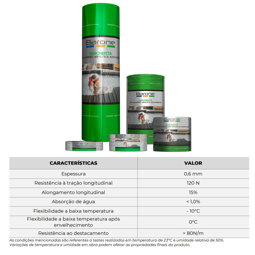 Fita autoadesiva flexível revestida com alumínio, asfalto e aditivos especiais, indicada para vedação de áreas internas, externas e detalhes construtivos. Fácil aplicação; Alta aderência em diversas superfícies; Elevada durabilidade; Utilizada para controle de temperatura; Produto Atóxico Áreas de Aplicação: - Telhados, pingadeiras, rufos e calhas; - Dutos de ventilação e ar condicionado; - Áreas expostas sem proteção mecânica; ATENÇÃO: Variações de temperatura e umidade em obra podem afetar as propriedades finais do produto. Informações Técnicas: Espessura: 0,6mm Cor: Prata Resistência à Tração Longitudinal: 120N Alongamento Longitudinal: 15% Absorção de Água: <1,0% Flexibilidade a Baixa Temperatura: - 10°C Flexibilidade a baixa temperatura após envelhecimento: 0°C Resistência ao destacamento: > 80N/m VALIDADE: 12 Meses com embalagem fechada.