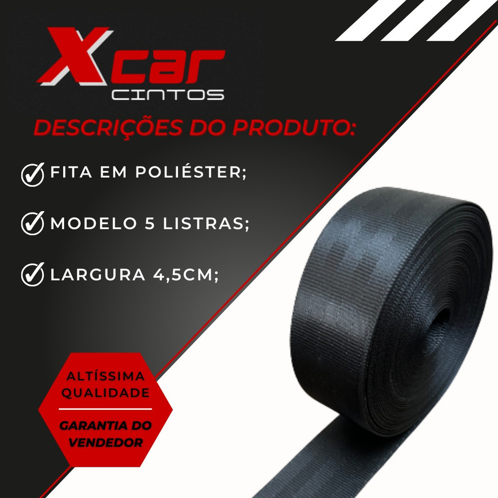 Somos o melhor custo-benefício do mercado, com mais de 20 anos oferecendo produtos originais de qualidade e preço acessível, somos referência na fabricação de cintos de segurança. Fornecemos para as maiores lojas de autopeças do Brasil. *Deseja um tamanho maior ou menor? Envie sua medida, nossa equipe irá criar uma OFERTA ESPECIAL para lhe atender! *Fita de 1ª linha universal para todos os carros, mesma fornecida para montadoras. Características: Materiais dos componentes: Poliéster, Aço carbono temperado e ABS. 1 anos de garantia. Material: Poliéster Comprimento: 1 metro Largura da fita: 4,5 centímetros Garantia: 3 meses Cor: Preto Tipo: 5 listras Garantia de fábrica: 3 meses. Para melhor desempenho, recomenda-se instalação por profissional qualificado. Benefícios do uso do cinto de segurança: Reduz o risco de ferimentos graves em acidentes de trânsito. Mantém o corpo estabilizado, evitando o impacto contra o volante ou painel. Garante segurança e conforto durante a condução. Atende às normas de segurança veicular exigidas por lei. Evita multas e pontuação na CNH por uso incorreto. Indicado para todos os veículos: carros, caminhonetes e utilitários. Fácil instalação e reposição, ideal para manutenção preventiva. Custo-benefício alto, sendo essencial para a segurança automotiva. Recomendações: - Instalar com apoio de profissional qualificado. - Garantia de 6 meses.