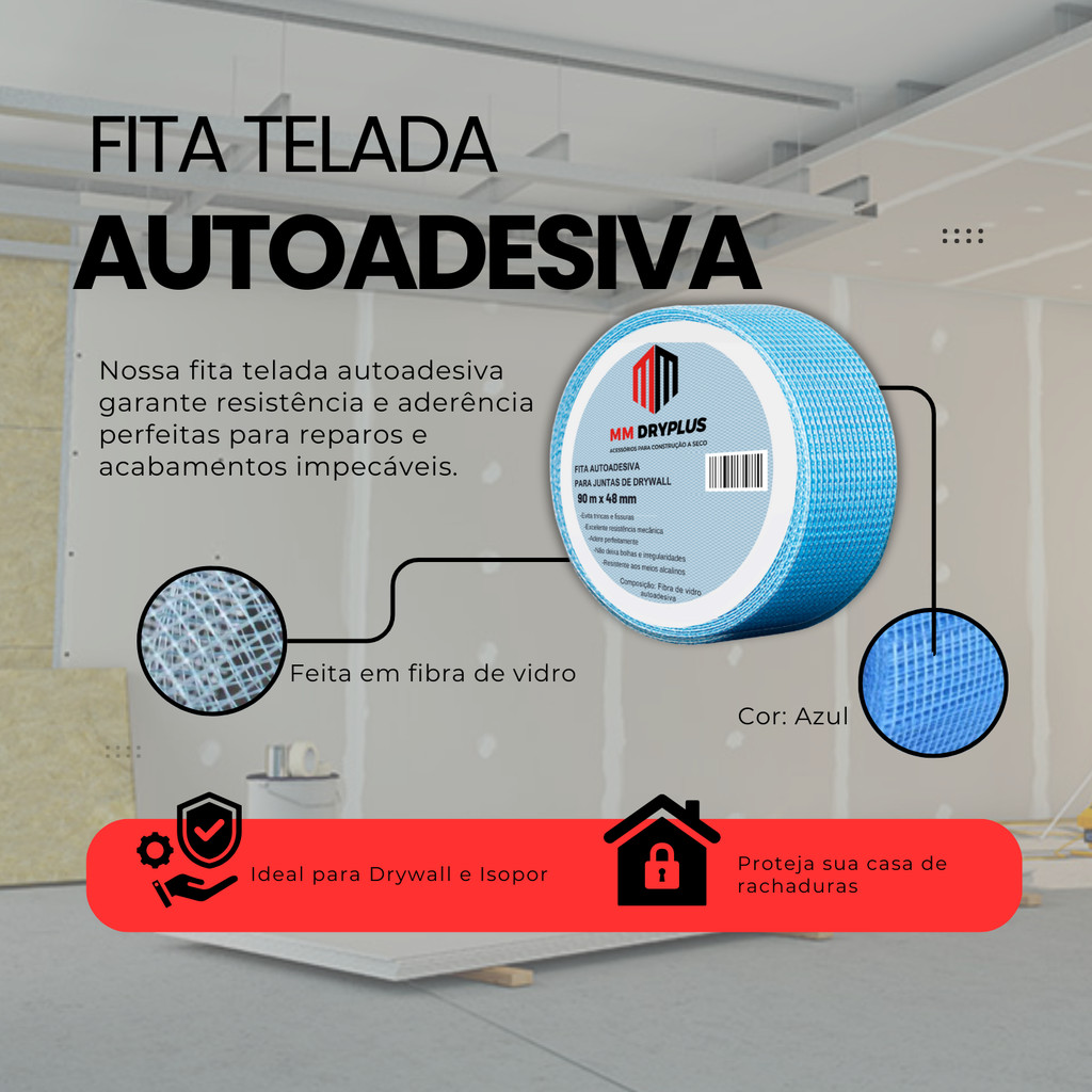 FITA TELADA AUTOADESIVA DE FIBRA DE VIDRO AZUL MM DRYPLUS 90m X 48mm A fita telada possui alta resistência à alcalinidade e excelente tenacidade mecânica. Feita em tela de fibra de vidro autoadesiva, permite a aplicação com maior facilidade, obtendo melhores resultados para os tratamentos de juntas de placas Drywall em paredes e tetos. Também pode ser aplicada em EPS (isopor). Evita trincas e fissuras. Malha: 9x9 Tamanho: 90m x 48mm Cor: Azul Peso: 65g/m²