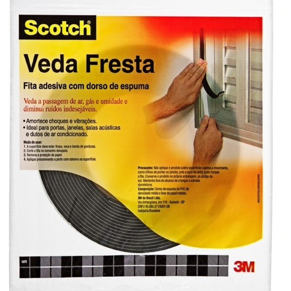 Fácil de aplicar Fabricada com espuma flexível de PVC e adesivo com alto poder de adesão 19 mm de largura e 5 mm de espessura A Fita Veda Fresta é o produto ideal para vedar a passagem de ar, gás e umidade, diminuindo ruídos indesejáveis e amortecendo choques e vibrações. Fácil de aplicar, ela é especialmente indicada para janelas, portas, salas acústicas e dutos de ar-condicionado. A Fita Veda Fresta é o produto ideal para vedação de ar, gás e umidade, diminuindo ruídos indesejáveis e amortecendo choques e vibrações. Fácil de aplicar, ela é especialmente indicada para janelas, portas, salas acústicas e dutos de ar-condicionado. Fabricada com espuma flexível de PVC de densidade média e adesivo com alto poder de adesão, a Fita Veda Fresta possui 19 mm de largura e 2 mm de espessura. Para utilizar o produto, a superfície deve estar limpa, seca e isenta de gorduras. Corte a fita no tamanho desejado e remova a proteção de papel. Depois, aplique, pressionando a parte com adesivo na superfície. Aplicações sugeridas Ideal para vedação de ar, gás e umidade, diminuindo ruídos indesejáveis e amortecendo choques e vibrações Especialmente indicada para janelas, portas, salas acústicas e dutos de ar-condicionado