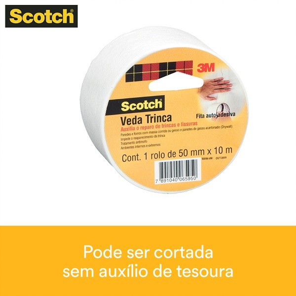A Fita Veda Trinca 3M Scotch auxilia no reparo de trincas e fissuras com menos de dois milímetros de profundidade, impedindo o reaparecimento da trinca. Flexível e fácil de ser aplicada, ela pode ser utilizada em paredes, forros com massa corrida ou gesso e paredes de gesso acartonado (drywall). Repara trincas e fissuras com menos de dois milímetros de profundidade Acompanha as movimentações da fissura sem se romper Possui tratamento antimofo É flexível e fácil de ser aplicada Possui boa resistência à tração, é permeável às argamassas e seu adesivo é resistente a intempéries Contem 1 rolo de 50mm x 10M Composição: Não-tecido de nayon de viscose microporoso com adesivo acrilico. Atenção: Não indicado para trincas estruturais. Em argamassa sem massa corrida ou gesso, a fita pode ficar aparente.