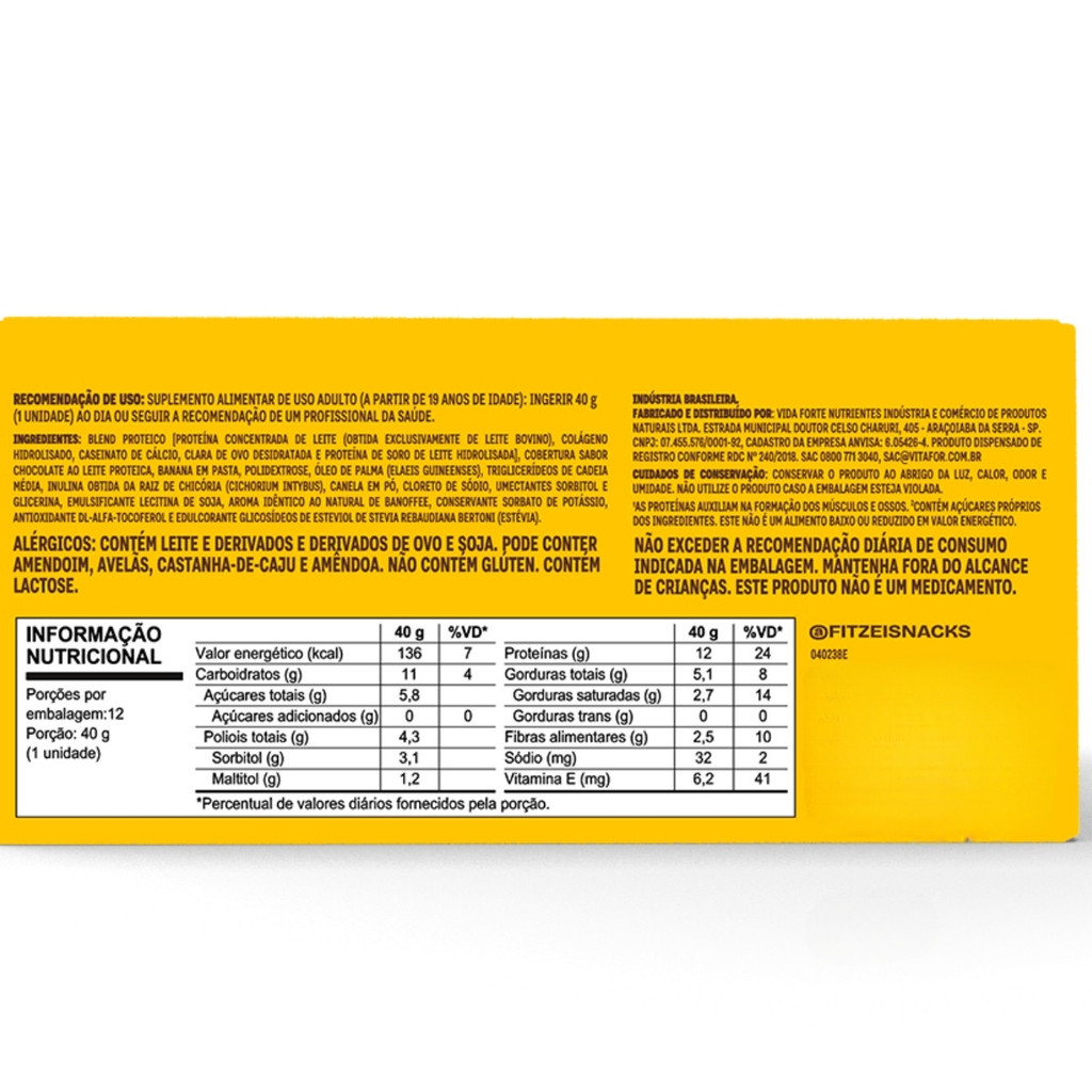 Sobre o Produto: A Fitzei® Banoffee da Vitafor é uma barra proteica funcional que une sabor irresistível com nutrição de qualidade. Inspirada na clássica sobremesa inglesa, essa versão traz o sabor marcante da banana com toques de caramelo e canela, tudo isso sem adição de açúcares e com recheio natural. Formulada com whey protein, fibras e vitamina E, é perfeita para quem busca um lanche saudável, prático e saboroso. Cada barra oferece 12g de proteína, é livre de glúten e possui baixo teor de sódio, sendo uma excelente aliada na rotina alimentar. Como Consumir - Consuma 1 barra (40g) ao dia ou conforme recomendação de nutricionista ou médico. - Ideal para ser ingerida entre as refeições, no pré/pós-treino ou como lanche nutritivo durante o dia. Benefícios - Auxilia na construção e manutenção da massa muscular (rico em proteína de alto valor biológico) - Proporciona maior saciedade em comparação a lanches ricos em carboidratos simples - Fonte de fibras que contribuem para o bom funcionamento intestinal - Contém vitamina E, com ação antioxidante - Zero adição de açúcares - Textura macia com sabor natural de banana e caramelo - Prática para transporte e consumo em qualquer lugar - Baixo teor de sódio - Sem glúten - Recheio com ingredientes naturais Alergênicos - Contém derivados de leite. - Pode conter amendoim, soja, castanhas e ovos. Ingredientes: Proteína concentrada do soro do leite (whey protein), banana desidratada, pasta natural de banana, fibras alimentares, extrato de caramelo, canela em pó, óleo vegetal, vitamina E, aromatizantes naturais, estabilizantes e edulcorantes. Advertências - Este produto não é um medicamento. - Não exceder a recomendação diária de consumo indicada na embalagem. - Manter fora do alcance de crianças. - Conservar em local seco, fresco e protegido da luz solar direta. - Pessoas com restrições alimentares ou condições médicas específicas devem consultar um profissional de saúde antes de consumir. Conclusão: A barra Fitzei® Banoffee da Vitafor é a união ideal entre sabor e nutrição. Com whey protein, fibras, ingredientes naturais e o sabor inconfundível de banana com caramelo, oferece uma alternativa saudável para os lanches do dia a dia. Sem adição de açúcares e com excelente valor proteico, é perfeita para quem deseja manter uma alimentação equilibrada sem abrir mão do prazer ao comer. Uma escolha prática e nutritiva para uma rotina mais saudável.