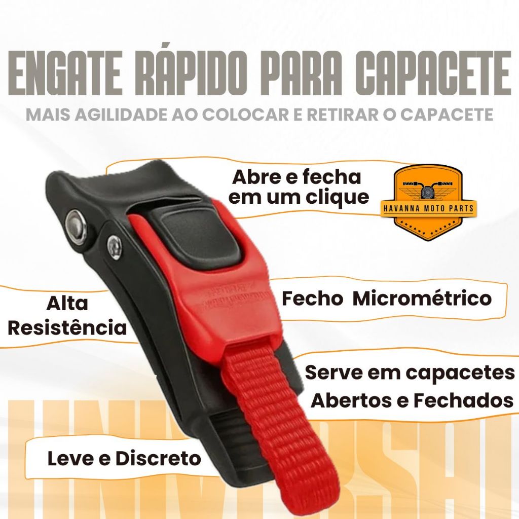 Engate Rápido Micrométrico para Capacete (Não acompanha a cinta jugular) Sistema de engate rápido para capacetes. Pode ser adaptado em qualquer capacete. O sistema mais seguro e prático disponível no mercado. O engate micrométrico Polivisor, além de oferecer a melhor resistência e qualidade do mercado, garante ajustes precisos e suaves para seu capacete. Além do ajuste milimétrico, o usuário poderá destravar a cinta do capacete com apenas uma das mãos. Qualidade, segurança e praticidade em um mesmo produto. Aplicação: Todos os tipos de capacetes (universal) Ideal para: Motociclistas urbanos e estradeiros Conteúdo da Embalagem: 01 Engate Fivela Rápida Micrometrico Universal (para uso em 01 capacete) Especificações: - Alta qualidade - Material: Plástico + Metal - Cor: Preto + Vermelho - Dimensões: (2.76 x 0.87 x 0.55) "/ (7 x 2.2 x 1.4) cm Características: - Fivela de alça de queixo profissional para qualquer capacete - Speed clip, lançamento rápido - Uma maneira segura, rápida e conveniente de proteger seu capacete. - Instalação fácil para o seu capacete - 9 engrenagens ajustáveis Benefícios: Sistema Micrométrico de Trava: Ajuste com precisão milimétrica, permitindo fixação firme e confortável. Ideal para uso diário, reduz o incômodo das fivelas tradicionais. Instalação Simples: Compatível com a maioria dos modelos de capacetes. Pode ser instalado com ferramentas básicas, sem necessidade de assistência técnica. Compatibilidade Universal: Serve em capacetes abertos, fechados e articulados, desde que possuam cinta jugular padrão. Alta Resistência: Fabricado com materiais duráveis, projetado para suportar uso intenso sem perder a eficiência de travamento. Mais Segurança no Trânsito: Evita solturas acidentais. O mecanismo de engate rápido é confiável e estável mesmo em trajetos longos e com trepidação. Importante!! - Recomendamos que a troca seja feito por um profissional de sua confiança. - Não nós responsabilizamos pelo mau uso do produto.