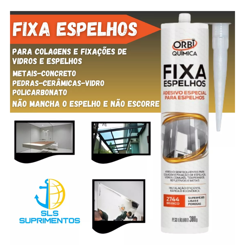 Fixar Espelhos Orbi 380g USO DO PRODUTO COM APLICADOR MANUAL ORBI ESPELHOS, fixa e veda espelhos, vidros especiais, laminados, temperados, refletivos, aramados e comuns; metais sensíveis, alvenaria, concreto e a maioria dos materiais utilizados na construção civil. CARACTERÍSTICAS: Recomendado para fixar e vedar espelhos, vidros laminados, temperados, refletivos e comuns Possui ótima capacidade de absorção de movimentos e vibrações Pode ser aplicado até mesmo em paredes com pequenas irregularidades Fixa espelhos e vidros especiais Não escore Não mancha Adere em superfícies úmidas VANTAGENS: Produto isento de solvente, não agride o meio ambiente, inodoro e não mancha. MODO DE USAR: 1º) A superfície deve estar limpa, seca e desengordurada. Recomendamos o uso de álcool. 2º) Rosquear o bico aplicador e cortar num ângulo de 45º. 3º) Aplique o produto em filetes verticais, com distanciamento entre si de 4-5cm. 4º) É necessário manter o espelho ou painel escorado, utlizando fita dupla face (sem solventes) em 06 pontas do espelho ou apoios para garantir uma ancoragem prévia até a cura total. ESPECIFICAÇÕES: Embalagem: 380 g. Importante: As colagens devem ser realizadas respeitando projetos adequados e realizados por profissionais qualificados, limitações técnicas e o estado de conservação e a capacidade de ancoragem das tintas e superfícies a serem coladas ou vedadas. Validade: 12 meses desde que mantido em lugar fresco e seco à temperatura de até 25°C. Observação: Antes de retirar as escoras certifique-se de que o ORBI ESPELHOS esteja completamente curado. Suporta entre 75kg e 80 kg por m2, considerando um cordão de 3mm/1m2 (lâmina de 1m2 e 3mm de espessura. Lembrando que para maior eficiência no poder de aderência, considerar cordão em formato piramidal (triangular), e não considerar cordão único na aplicação. Considerar espaçamento de aproximadamente 5cm entre cordoes e sempre na vertical. Marca Orbi Modelo 2744 Embalagem: 380 gr Cor: Branco