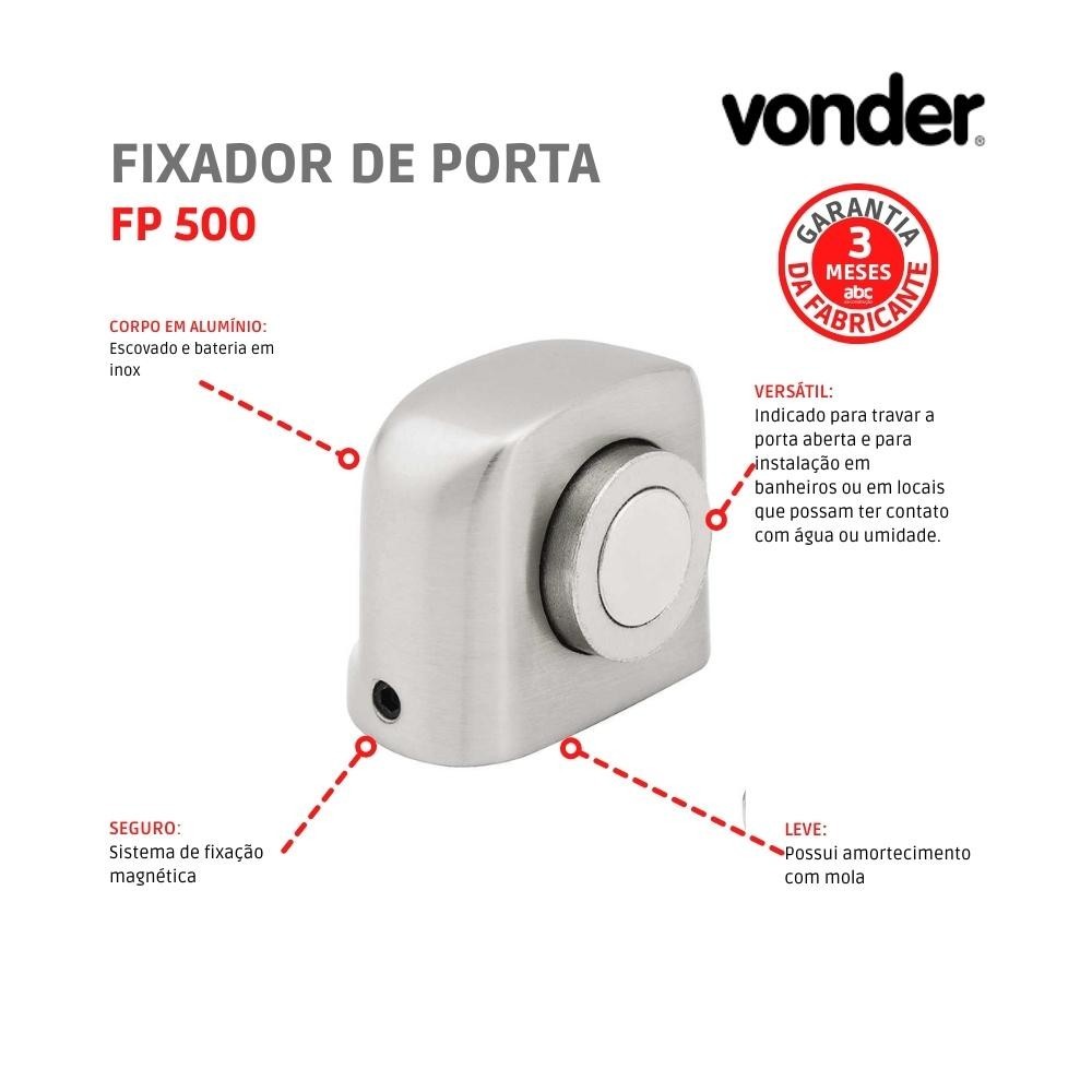 SOBRE O PRODUTO Conheça o Fixador De Porta FP 500 Alumínio Vonder. Produto que possui corpo em alumínio escovado e batente (imã) em aço inox, com sistema de fixação magnética e amortecimento com mola. Indicado para travar a porta aberta e para instalação em banheiros ou em locais que possam ter contato com água ou umidade, pois o ímã e o batente fixado na porta não oxidam. DIFERENCIAIS - Corpo em alumínio: Escovado e batente em aço inox. - Seguro: Sistema de fixação magnética - Leve: Possui amortecimento com mola - Versátil: Indicado para travar a porta aberta e para instalação em banheiros ou em locais que possam ter contato com água ou umidade. CONTEÚDO DA EMBALAGEM - 1 Fixador de porta magnético - 1 Chave allen - 2 Buchas plásticas 6 mm - 3 Parafusos madeira cabeça chata phillips GARANTIA 90 dias SOBRE A FABRICANTE A VONDER é a principal marca do Grupo OVD, um dos maiores atacadistas de ferragens e ferramentas do país, com 50 anos de mercado. Sendo uma das marcas mais completas do Brasil em sua categoria, detentora do melhor e mais completo mix de ferragens, ferramentas, máquinas e equipamentos para uso profissional do mercado. Um histórico de trabalho e crescimento muito expressivo, incrementando seus produtos ano a ano e surpreendendo por sua evolução e aprimoramento em diversos segmentos e linhas, sempre primando pela máxima qualidade de suas ferramentas e ampla variedade de produtos.
