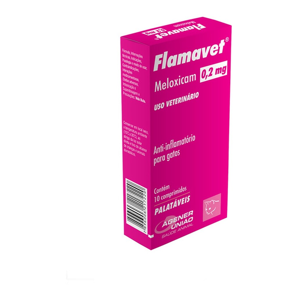 Flamavet 0,2mg -C/10 Comprimidos O Anti-Inflamatório Agener União Flamavet para Gatos é um anti-inflamatório não esteroidal COX-2 seletivo e analgésico para gatos. Confere maior segurança no trato gastrointestinal e aos rins. Indicações: O Flamavet é o único Anti-Inflamatório não esteroidal (Aine) com apresentação exclusiva para gatos. Indicado para a analgesia pós cirúrgica, além de inflamações agudas decorrentes de contusões, traumas e para processos inflamatórios crônicos presentes principalmente nas osteoartroses de gatos e cães - Indicado para gatos; - Anti-inflamatório não esteroidal; - Ideal para o controle das dores pós-operatórias, feridas e lacerações cutâneas; - Comprimidos palatáveis, - A embalagem contém 10 comprimidos. Posologia: Gatos: 0,2 mg: 0,1 mg / kg / VO / no primeiro dia; após 0,05 mg / kg / VO / a cada 24 horas por até 21 dias*. Benefícios: - Altamente palatável; - Fácil administração; - Concede maior segurança no trato gastrointestinal do pet. Especificações: Pet: Gatos Uso: Oral Apresentação: Disponível em embalagem com 10 comprimidos Tipo: Anti-inflamatório, Analgésico e Antitérmico