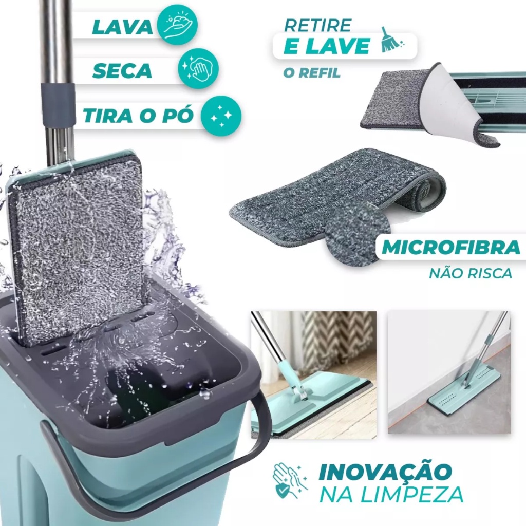 Flat Mop 2 Refis Esfregão Com Balde Rodo Mágico Lava Seca Tira Pó