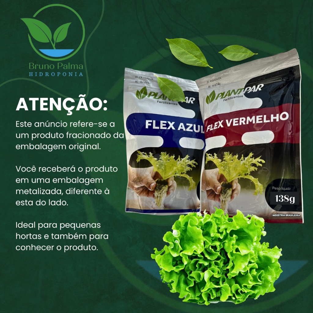INFORMAÇÕES SOBRE O PRODUTO: ESTE ANÚNCIO REFERE-SE A UM PRODUTO FRACIONADO DA EMBALAGEM ORIGINAL. COM ISSO, VOCÊ IRÁ RECEBER O MESMO EM UMA EMBALAGEM SIMILAR. Nosso nutriente é muito simples de utilizar pois resume-se em apenas 2 pacotes. Basta misturar na água os nutrientes “Flex Azul + Flex Vermelho” na mesma proporção e sua solução nutritiva estará pronta. Formulação 100% completa com todos os micro e macro nutrientes. Possui toda nutrição que suas folhosas precisam para se desenvolver. Diferente de outras marcas, você não precisará adicionar nenhum outro mineral para compor a solução nutritiva, como ferro por exemplo. Irá utilizar apenas este produto, desde a produção da muda até a colheita. Se você for iniciante não se preocupe, pois aqui no anúncio fornecemos as instruções de preparo que são bem simples. No rótulo do produto, o fabricante também passa as orientações de preparo. Estes nutrientes são utilizados para o cultivo de folhosas como alface, rúcula, agrião, coentro, salsinha, cebolinha, couve, dentre outros. Rendimento: 200 à 250 litros de solução nutritiva. INSTRUÇÕES DE PREPARO: Para cada 10 litros de água, utilizar 5g do Flex Azul + 5g do Flex Vermelho. Para cada 100 litros de água, utilizar 50g do Flex Azul + 50g do Flex Vermelho. Para facilitar o preparo e a mistura, coloque um pouco de água em um balde e adicione o Flex Azul. Misture bem e despeje no seu reservatório. Repita o procedimento com o Flex vermelho. Condutividade Elétrica recomendada: Produção das mudas: 250 à 300ppm / 0.5 à 0.6mS Fase intermediária: 500 à 600ppm / 1.0 à 1.2mS Fase Final: 700 à 900ppm / 1.4 à 1.8mS Importante ressaltar que a condutividade elétrica a ser utilizada não é padronizada. Em regiões de clima muito quente, recomenda-se utilizar uma condutividade mais baixa. Já em clima mais fresco, a condutividade pode ser maior. GARANTIAS FLEX VERMELHO: Nitrogênio: 8% Fósforo: 8% Potássio: 30% Enxofre: 3% Magnésio: 1% Ferro: 0,14% Boro: 0,04% Manganês: 0,04% Cobre: 0,03% Zinco: 0,019% Molibdênio: 0,009% Níquel: 0,006% Cobalto: 0,002% GARANTIAS FLEX AZUL: Nitrogênio: 10% Cálcio: 15% Magnésio: 2% PERGUNTAS FREQUENTES: Gostaria de comprar outros produtos junto para aproveitar o frete, é possível? R: Sim, é possível. Você pode clicar em ver mais anúncios do vendedor para ter acesso a toda nossa loja. Em seguida, basta adicionar todos produtos que deseja no carrinho de compras e fechar o pedido no final. Além das folhosas, posso usar este nutriente para produzir tomate, morango, pimenta, etc? R: Sim, pode. Este nutriente é muito completo e consegue atender muito bem outras culturas. De quanto em quanto tempo preciso repor os nutrientes? R: Conforme a necessidade. O nível do reservatório vai baixando e você vai fazendo a reposição com mais água e nutrientes. Ideal ter um medidor de condutividade. Posso utilizar o produto em um sistema de gotejamento? R: Sim, pode ser utilizado. Quais são os minerais que formulam este nutriente? R: Este produto possui todos os micro e macronutrientes necessários para o crescimento das plantas. Ele é 100%, não precisa adicionar mais nada para complemento. Este nutriente atende todas as fases das plantas? R: Sim, do início ao fim. Você vai usar ele desde a produção da muda até o dia da colheita. Você tem embalagens maiores do produto? R: Sim, temos kits de 1.000, 5.000 e 20.000 litros. Basta clicar em ver mais anúncios do vendedor. Qual o vencimento do produto? R: Sempre trabalhamos com estoque novo tendo validade alta. Você terá em torno de 2 anos para usar após a abertura da embalagem. Porém, o produto sendo guardado da forma correta, com embalagem sempre fechada, ele dura muito mais tempo. Quantas plantas consigo produzir com um kit de 1.000, 5.000 e 20.000 litros? R: Em torno de 250 plantas para cada 1.000 litros de solução. Este produto interfere no pH da água? R: Sim. Ele tende a baixar um pouco o pH devido seus minerais. Isso acaba sendo uma boa vantagem, já que normalmente na Hidroponia precisamos estar usando redutor de pH. Posso usar para regar plantas que estão em vasos ou no solo? R: Poder pode. Apesar do produto não ser específico para isso você pode regar suas plantas 1 ou 2x na semana com o nutriente. Porém, a rega deve ser feita direta na terra e não por cima das folhas. Comprando mais de uma unidade eu tenho desconto no frete ou frete grátis? R: Isso depende muito do valor do produto, da sua localidade e reputação no Mercado Livre. Você pode ir adicionando mais unidades no carrinho e ir conferindo como ficará o frete. Como dissolver este produto na água? R: É bem simples fazer o preparo. Você vai usar os dois nutrientes em dosagens iguais. São 42g de cada pacote para cada 100 litros de água. Basta adicionar a dosagem correta de cada um na água e misturar. Qual a diferença deste nutriente para aqueles outros anúncios que vem com 5 ou 6 pacotes? R: Este nosso nutrie