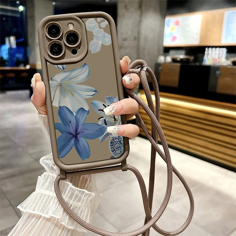 Flor azul retrô, cordão de capa TPU para iPhone 11 16 15 14 13 12 Pro Max XS XR X