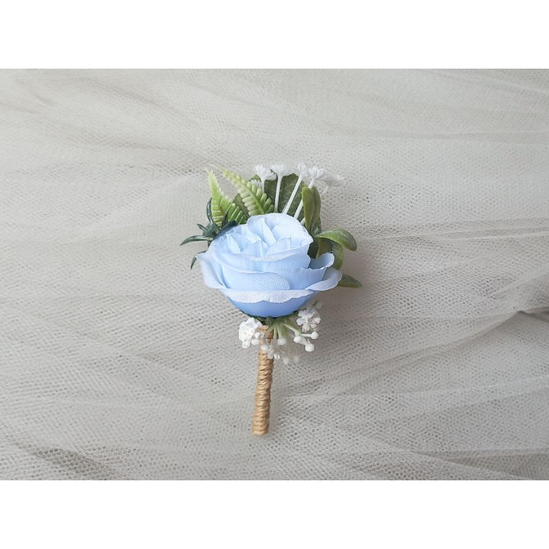 Flor de lapela produzida com flor permanente Azul bebê . Detalhes em gipsophilas brancas e cabo rústico.
