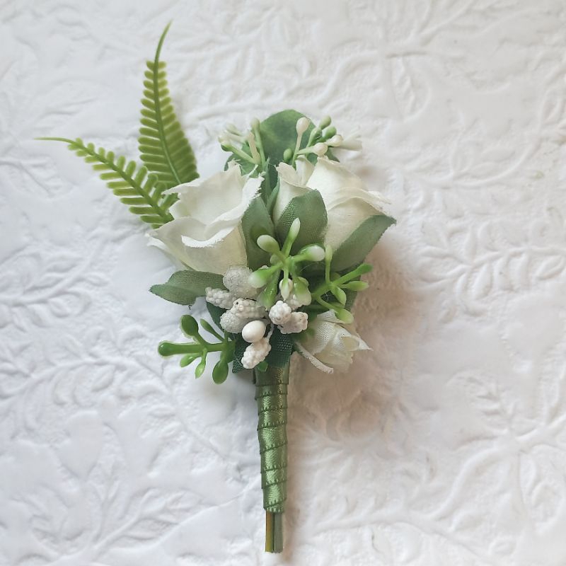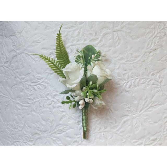 Flor de lapela, produzida com flores permanentes tons brancos e verde. Cabo en cetim.Se quiser poderá ser rústico. altura:12 cm