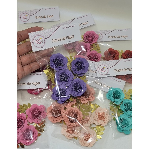 ******Tamanho: entre 3,5 e 4 cm cada flor. Pequena variação por ser um processo manual.****** !!!!!!!!!!!!ATENÇÃO: Na opção de 2 ou 3 kits, são todos os kits da mesma cor. NÃO enviamos cores diferentes.!!!!!!!!!!!! Fotos reais do produto! Kit com 5 flores da mesma cor. As flores vão embaladas em pacote plástico com lapela. As folhinhas já vão coladas nas flores, para facilitar o uso. Prontas para usar em enfeite de bolos, lembrancinhas, doces ou caixas. Material: papel colorido 180 gramas e papel dourado 255 gramas. Papel não resistente à água. * Pode haver uma variação de cor devido às configurações do monitor ou tela.