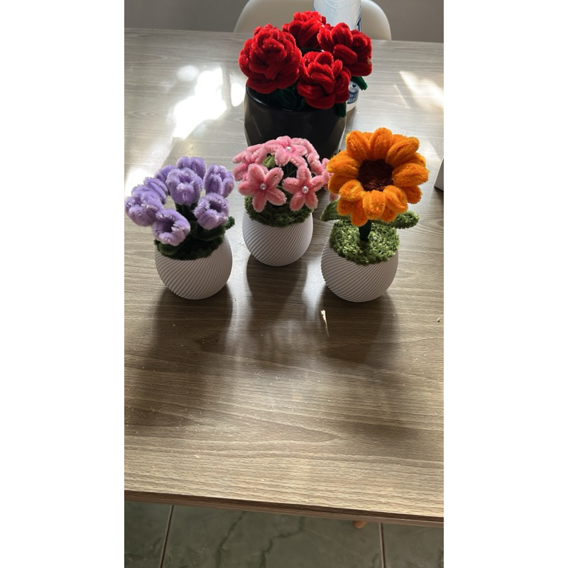 Arranjos perfeitos para decorar seu móvel ou ambiente preferido. Ótima escolha para ser usado como centro de mesa em festas e eventos. Perfeito para presentear aquela pessoa especial. Produzido artesanalmente com hastes de chenille e perfumados com delicada essência de vanilla. Escolha entre as 6 opções disponíveis: Girassol Crisântemo Mini Tulipa Margarida Amarela Lírio Margarida branca Atenção: o Kit contém um girassol e dois arranjos aleatórios. Verifique os modelos disponíveis no chat. Altura: Pode variar de 17cm a 20 cm com a flor. Largura do vaso: 6cm Cuidado ao manusear e evite contato com água pois pode danificar o produto.