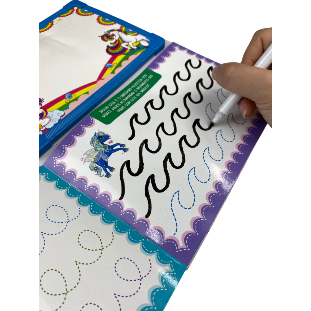 Atividades divertidas e educativas para os pequenos aprenderem de maneira fácil e divertida com os Unicórnios da Floresta Encantada. Acompanha uma caneta para escrever, desenhar e apagar quantas vezes quiser!
