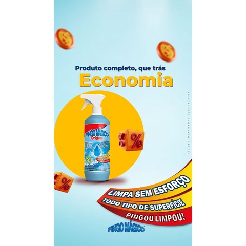 Pingo Mágico Original | Flotador Multifunções O Pingo Mágico Original é um flotador multifunções de alta tecnologia, sustentável e biodegradável, desenvolvido para oferecer limpeza profunda e instantânea em qualquer superfície, sem esforço e sem agressão ao material ou à pele. Ideal para quem busca praticidade, eficiência e segurança em um único produto. Indicado para todo tipo de limpeza: Fogões, cooktops e grelhas Estofados, colchões e tapetes Box de banheiro, vidros e azulejos Pisos, porcelanatos e paredes Fachadas, toldos, motos e carros Roupas e tênis (uso com cuidado) Entre outros Remove facilmente resíduos como: Gordura, óleo e graxa Limo, mofo e fuligem Cera e cola de adesivos Sujidades e odores de pets Manchas de suor, batom, poeira e chiclete Modo de usar: Molhe a superfície e borrife o Pingo Mágico; Deixe agir por 3 a 5 minutos; Esfregue com esponja ou vassoura multiuso; Enxágue com água corrente; Seque com pano limpo e pronto! Vantagens e diferenciais: Limpeza instantânea e sem esforço, mesmo nas sujeiras mais difíceis Produto dermatologicamente testado, seguro para pele e vias respiratórias Livre de cloro, soda, amônia, ácidos e solventes (alifáticos e aromáticos) Desenvolvido com ingredientes naturais, pesquisa e tecnologia Produto testado em laboratório específico, sem testes em animais Eficaz em superfícies fixas: granito, mármore, porcelanato, vidros, inox, alumínio, acrílicos, policarbonatos, azulejos, epóxi, PU, fórmica, entre outros O Pingo Mágico combina inovação e sustentabilidade, tornando a limpeza mais prática, segura e eficiente para qualquer ambiente.