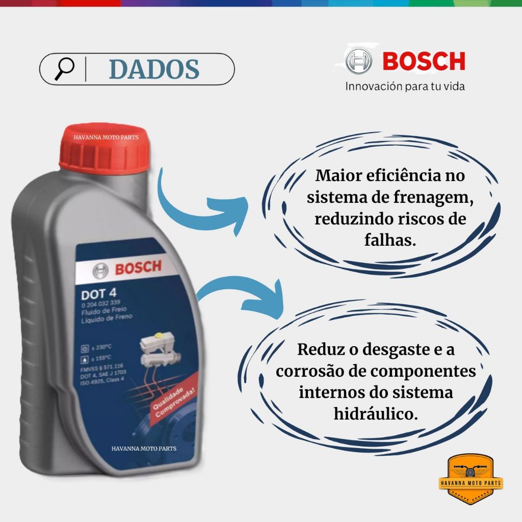 Kit Fluidos de Freio O fluido de freio tem papel fundamental no sistema de frenagem do veículo, sendo responsável por garantir a sua eficiência. Ele tem a função de transferir a pressão exercida no pedal de freio para o acionamento das pastilhas e sapatas. Então os fluidos são classificados de acordo com sua temperatura de ebulição, onde o DOT 3 apresenta ponto de ebulição a 205°C, o DOT 4 ferve a 230°C e o DOT 5, suporta temperaturas de até 250°C antes de mudar de estado físico. Em resumo, quanto maior o DOT, mais resistente o fluido a temperatura. Aplicação: Carros Pick-ups Motocicletas Caminhões Ônibus Tratores Universal / Líquido higroscópico Conteúdo da embalagem: 02 Fluidos de freio dot 4 Bosch 200 ml cada (Totalizando 400ml) **Verificar o nível do líquido no veículo pelo menos uma vez por mês.** Especificações: - Umidade: 0,075% m; - Ponto de Ebulição seco: 245°C; - Ponto de Ebulição úmido: 220°C; - Densidade a 20°C: 1,11 g/cm³; - Transmissão: Automático e Manual; - Volume: 200ml. Modo de Uso: - Na troca, lavar o sistema com fluido novo antes de completar o reservatório até o nível indicado. - Seguir as recomendações do fabricante do veículo. Verificar o nível do fluido pelo menos 1 vez por mês e substitui-lo segundo o manual de instruções ou a cada 12 meses. - Evitar o contato do fluido com lonas e pastilhas de freio, evitar derramar sobre a pintura do veículo. - Evitar o contato do produto com óleo mineral, graxas e outros materiais. A substituição do fluido para freios AUMENTA A SUA SEGURANÇA E PROTEÇÃO AO DIRIGIR !!!!
