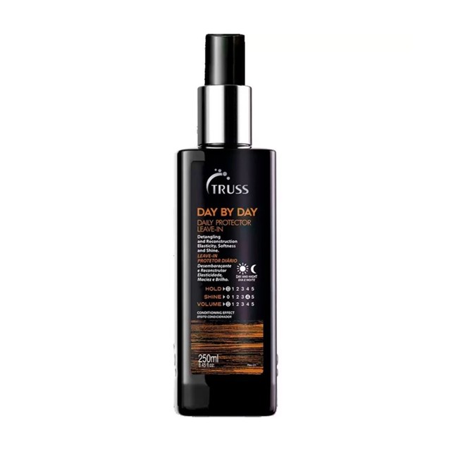 O Day by Day da Truss é um protetor diário nutritivo desembaraçante e reconstrutor para cabelos fragilizados, danificados, ressecados e que não têm tendência a oleosidade. Perfeito para recuperar e manter o cuidado diário dos fios. Modo de uso: Borrife sobre as pontas no cabelo seco ou molhado. Especificações: O Glow System ativo tecnológico inteligente que proporciona gloss de brilho extraordinário em efeito 3D, nutre e protege a cor dos cabelos coloridos e cria um filme de proteção duradouro. O Aminoácido de Menor Estrutura Molecular que penetra com facilidade na fibra capilar, devido à bioafinidade com os fios, proporciona ação reparadora da cutícula, formando filme protetor contra agressões externas. Restaura a flexibilidade e resistência dos fios, protegendo cabelos quimicamente tratados. Hidrata e devolve ao cabelo, brilho, maciez e penteabilidade. Resgata a flexibilidade natural dos fios. A Keratin é uma proteína rapidamente absorvida pelos fios, aumentando sua resistência e proporcionando corpo ao cabelo. As Ceramides formam um complexo lipoproteíco, restabelecendo a coesão das cutículas do cabelo. Protegem com eficácia cabelos coloridos. Proporcionam brilho e proteção do couro cabeludo. Cereal Protein: Proteínas que formam filme hidratante e protetor. O Lipo Nutrient repõe as frações lipídicas na fibra capilar, previne os danos físico - químicos externos, melhora a maciez, textura e suavidade ao toque dos cabelos fragilizados. Restaura a delicada camada bio-protetora do couro cabeludo, frequentemente danificada por agentes químicos.