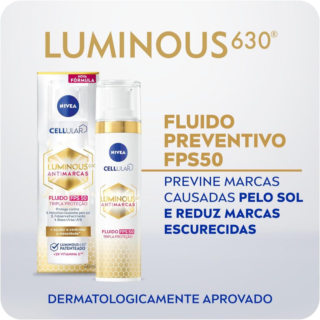 Fluido Facial Luminous 630 Antimarcas FPS50 Cellular Nivea 40ml - 1 Unidade O Fluido NIVEA Cellular Luminous 630 Antimarcas FPS 50 traz uma fórmula avançada capaz de reduzir as manchas existentes e evitar o seu reaparecimento, deixando a pele mais uniforme e luminosa. Com textura leve rapidamente absorvida pela pele e fator de proteção solar 50, também previne o fotoenvelhecimento enquanto hidrata a pele com a ação do ácido hialurônico e vitamina E. Benefícios: Ácido Hialurônico e Vitamina E: ajudam a reforçar a barreira de proteção natural da pele contra agressões externas, oferecem potente efeito hidratante e potencializam a ação do produto. Luminous 630: combate manchas escuras causadas pelos três principais fatores – exposição solar, envelhecimento e alterações hormonais. Essa tecnologia exclusiva atua na pigmentação existente, para iluminar as manchas escuras e reduzir o seu tamanho; e equilibra a produção de pigmentação para prevenir o aparecimento de novas manchas. Modo de Uso: De manhã, após a rotina de limpeza da pele, passe o fluido do centro para fora do rosto, em movimentos circulares. Evite contato direto com os olhos.