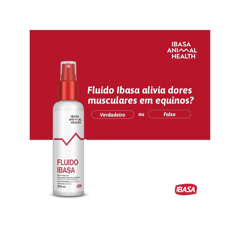 Validade: Maio/2027 Fluido Ibasa Spray muscular para tratamento de dores crônicas causadas por entorses, distensões, pancadas e bursites. Facilmente absorvido pela pele prolongando assim o efeito. Indicado para tratar dores, entorses, distensões musculares e dos tendões, bursites e qualquer lesão traumática do tecido subcutâneo de equinos . Uso em cavalos de corrida. COMPOSIÇÃO Cada 100 ml do produto contém: SUBSTÂNCIA.................QTDE. Essência de terebintina....10,0 ml Salicilato de metila.......5,0 g Cânfora....................1,0 g Álcool etílico q.s.p.......100,0 ml MODO DE USAR Em fricções, massagens, sendo a parte massageada sempre que possível protegida por uma atadura. Em aplicações diárias, uma ou mais vezes. PRECAUÇÕES Não aplicar o produto em feridas abertas. Apresentação Frasco 100 ml e Frasco 200 ml