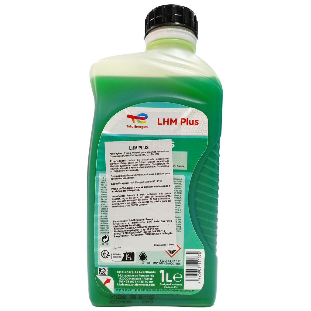 LHM Plus é um fluido hidráulico mineral para centrais hidráulicas de veículos Citroën XM, Xantia, BX, CX, SM, GS. Especificações: PSA Peugeot Citroën B71 2710. Benefícios: Índice de viscosidade excepcionalmente elevado; Grande estabilidade térmica; Excepcional proteção contra a corrosão; Excelente poder lubrificante. Centrais hidráulicas de veículos Citroën XM, Xantia , BX , CX , SM , GS. - Centrais hidráulicas de veículos Citroën ID e DS comercializados desde 09/1996 ( peças pintadas em Verde ). - Sistemas de freio e de comando hidráulico de utilitários Citroën N , P e C35 Sistemas de freio Ami 8 , Ami Super , Dyane e Mehari desde 09/1997 e 2CV desde 07/1982. - Corretor de posição de Peugeot 405 A. - Não miscível e não compatível com fluidos sintéticos, assim como líquidos de freio sintéticos DOT 3, DOT 4 , DOT 5.1 e os antigos fluidos Citroën do tipo LHS 2 - Índice de viscosidade excepcional elevado. - Baixo ponto de fluidez . - Grande estabilidade térmica. - Excelente poder lubrificante. - Temperatura de ebulição elevada e não sensível a umidade. - Excepcional proteção contra a corrosão. PSA Peugeot Citroën B71 2710