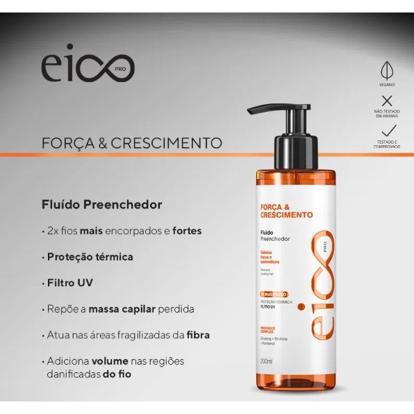 Contém: 1- Eico Professional Fluido Preenchedor Força e Crescimento 200ml 1- Eico Professional Booster Biotina Força e Crescimento 30ml Sem Sal, Sem Parabenos, Sem Petrolatos, Sem Corante - Linha Liberada A linha Tratamento Força&Crescimento Eico Professional foi desenvolvida para aqueles cabelos com queda, enfraquecidos e quebradiços. Tratamento eficaz combatendo a queda fortalecendo da raiz até as pontas e estimulando muito o crescimento deixando seus cabelos cumpridos e fortes. Ativos: Biotina, Giseng, Pantenol e ProForce Complex Fluido: Com o cabelo limpo e úmido, borrife o Spray Finalizador Força & Crescimento por toda a extensão dos fios. Inicie o processo de escovação e pranche se desejar. Para um melhor resultado, utilize a linha completa Força & Crescimento. Booster: Aplique a Booster Biotina nos cabelos molhados, logo após o Shampoo Força & Crescimento. Deixe agir por 2 minutos, enxágue e aplique o Condicionador Força & Crescimento no comprimento e nas pontas. Use a Booster Biotina de 1 a 2 vezes por semana.