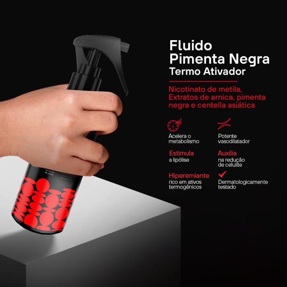 Oii, é um prazer ter você aqui! Já sentiu aquele incômodo que vem acompanhado das medidas extras e celulites? A busca por essa redução pode ser uma jornada desafiadora. É natural querer uma solução eficaz e confiável. É aqui que o Fluido Ativador Pimenta Negra Labotrat entra em cena, oferecendo uma abordagem revolucionária para transformar sua rotina de cuidados com a pele e alcançar seus objetivos estéticos desejados. O que é: - Fluido Termo Ativador Pimenta Negra 250ml. - Potente vasodilatador. - Hiperemiante. - Rico em ativos termogênicos. - Dermatologicamente testado. - Não testado em animais. O que tem: - Extrato de arnica. - Pimenta Negra. - Centella Asiática. - Nicotinato de metila. - Ação Lipolítica. O que faz: - Auxilia na redução de celulite e gordura localizada. - Acelera o metabolismo. - Estimula a lipólise. - Favorece a drenagem de líquidos. - Facilita a permeação de ativos. - Potencializa a oxigenação da pele. - Estimula uma melhor resposta aos tratamentos corporais estéticos. Como usar: - Higienize e esfolie a área a ser tratada. - Borrife o produto e deixe a pele absorver. - Não remover. - Pode ser usado antes ou após a massagem e antes das atividades físicas. Importante: - Recomenda-se o uso para a região do abdômen, glúteos e coxas. - Não é recomendado o uso em outras partes do corpo, devido ao aquecimento e vermelhidão provocada na pele. - Faça prova do toque antes de usar o produto. Com o Fluido Ativador Pimenta Negra Labotrat, você está a um passo de revitalizar sua jornada estética. Dê um novo impulso à sua confiança, abraçando a beleza que é verdadeiramente sua. Surgiu alguma dúvida? Entre em contato com a gente! Boas Compras :)