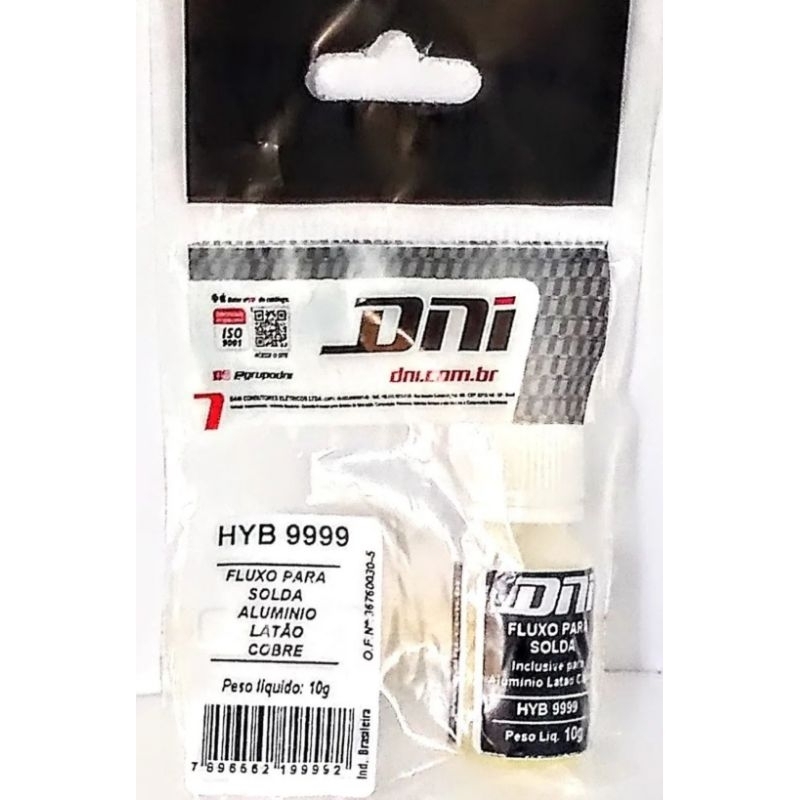 Fluxo que facilita a soldagem de fios com liga de Cobre, Alumínio e Latão (fácil remoção) Fácil remoção, solúvel em água Composição: Borato Bi fluoreto de K e Fluoreto de Amônio Embalagem: Frasco de 10 gramas (peso liquido) Validade indeterminada Produto de Qualidade marca DNI (fotos reais do produto)