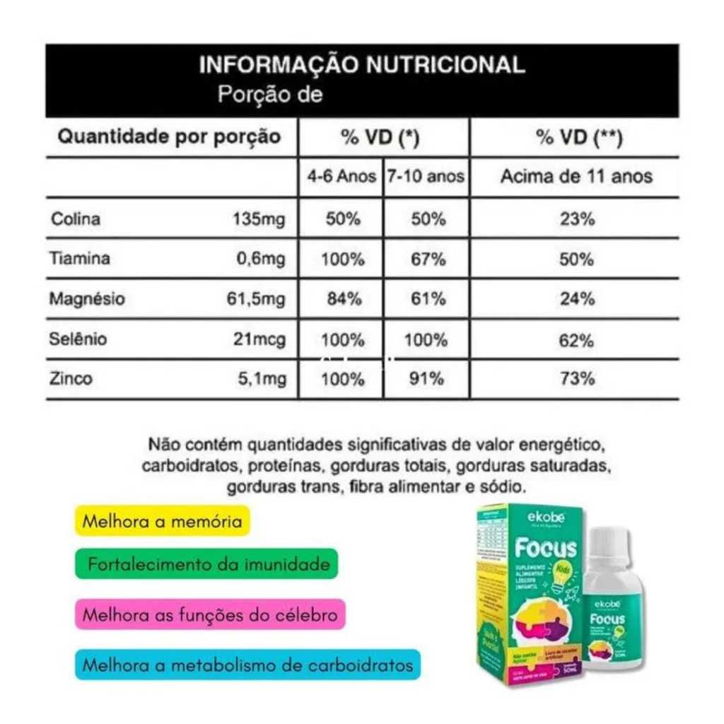 ///// FOCUS KIDS ////// Suplemento alimentar que auxilia a manter ou elevar a saúde do cérebro de crianças e adolescentes FOCUS KIDS contém colina (vitamina B10), tiamina (Vitamina B1), magnésio, selênio e zinco. FOCUS KIDS reúne vitaminas e minerais que contribuem para aumentar a capacidade intelectual e prevenir as disfunções cognitivas. FOCUS KIDS foi especialmente desenvolvido para melhorar os níveis de atenção, concentração e memória de crianças e adolescentes. FOCUS KIDS pode prevenir eventuais distúrbios como Dificuldade de Aprendizagem, Transtorno de Aprendizagem ou Transtorno de Déficit de Atenção com Hiperatividade (TDAH). Descrição: Suplemento auxiliar da imunidade. INGREDIENTES: Água purificada, veículo glicerina, cloreto de colina, sulfato de magnésio, sulfato de zinco, conservador sorbato de potássio, aromatizante artificial de tutti-frutti, cloridrato de tiamina (vitamina B1), edulcorante sucralose e selenito de sódio. NÃO CONTÉM GLÚTEN. Recomendações de uso: Administrar 30 gotas, uma vez ao dia. Diluir em água, suco, leite ou outra bebida. AGITE ANTES DE USAR. Este produto é recomendado para crianças a partir de 4 anos. Precauções: CONSERVAR AO ABRIGO DA LUZ, CALOR E UMIDADE. ESTE PRODUTO NÃO É UM MEDICAMENTO NÃO EXCEDER A RECOMENDAÇÃO DIÁRIA DE CONSUMO INDICADA NA EMBALAGEM MANTENHA FORA DO ALCANCE DE CRIANÇAS GESTANTES, NUTRIZES E CRIANÇAS DE ATÉ 3 (TRÊS) ANOS, SOMENTE DEVEM CONSUMIR ESTE PRODUTO SOB ORIENTAÇÃO DE NUTRICIONISTA OU MÉDICO Clique no botão "Comprar agora" para garantir Focus Kids Ekobe Suplemento Alimentar Líquido Para Memória pelo melhor preço!