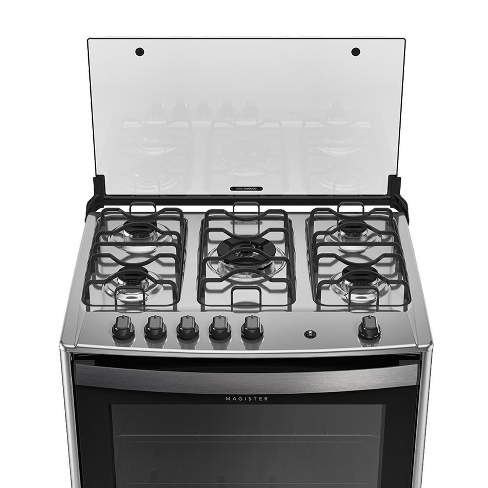 Fogão 5 Bocas Magister Mesa Inox Preto - Dako Para uma cozinha mais prática e funcional o Fogão Dako é a solução! Possui acendimento automático que garante mais agilidade no preparo dos alimentos. Além da sua mesa em Inox que facilita na hora da limpeza. Esse fogão vai ser o companheiro ideal para as receitas do dia a dia! Veja mais características do Fogão 5 Bocas Magister Mesa Inox - Dako: - Design Moderno. - Tipo: Piso. - 5 Bocas. - Mesa: Inox. - Acendimento: automático. - 1 Queimador Tripla Chama de 3300W. - 2 Queimadores Família de 2000W. - 2 Queimadores de 1700W. - Forno. - Capacidade: 100 Litros. - 1 Grade deslizante e 1 auto deslizante. - Luz interna. - Vidro duplo. - Válvula de segurança. - Classificação energética: A. - Voltagem: 220V. - Cor: Preto. - Garantia: 1 ano. - Dimensões do Produto (LxAxP): 76 x 96 x 63,3cm. Aqui estão 5 perguntas e respostas frequentes: 1. A Mesa Inox Preto é resistente e fácil de limpar? Resposta: Sim! A mesa combina a durabilidade e resistência do Inox com um acabamento sofisticado na cor preta. Essa superfície é feita para ser extremamente fácil de limpar, resistente à corrosão e garante um visual elegante e moderno para sua cozinha. 2. Este modelo Magister possui queimadores de alta potência? Resposta: Sim, ele possui um potente Queimador Tripla Chama na posição central (3.300W). É a potência ideal para quem busca agilidade e alta performance no cozimento, sendo perfeito para panelas maiores e receitas que exigem fogo forte. 3. O forno é fácil de limpar internamente e possui bom espaço? Resposta: Absolutamente. O forno conta com um excelente espaço interno e possui o Revestimento Limpa Fácil (Easy Clean). Essa tecnologia de esmalte de baixa porosidade reduz drasticamente a aderência de gordura, facilitando a limpeza após o uso. 4. As trempes (grades) são estáveis e seguras para panelas pesadas? Resposta: Sim, o Magister vem com trempes de ferro fundido robusto e individuais. Elas proporcionam máxima estabilidade e segurança para suas panelas, resistem melhor ao calor e garantem a durabilidade e confiança necessárias no uso diário. 5. A ignição e o controle dos botões são práticos? Resposta: Sim, o fogão possui Ignição Automática Total e botões Top Control (na mesa). Isso significa que o acendimento de bocas e forno é feito com um simples girar de botão, oferecendo conforto, ergonomia e segurança imediatos. Tambem procurado como: fogao dacô magister mesa inox preta dako majister fogão 5bocas inoz magister 5 chamass