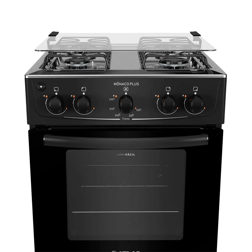 Fogão Atlas Mônaco Plus Preto 4 Bocas Mesa Inox Limpa Fácil Acendimento Automático Forno Robusto Design