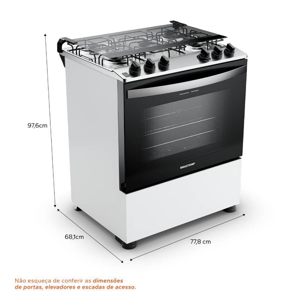 Fogão Brastemp Piso 5 Bocas Branco com Botões Removíveis e Aro Protetor Bivolt - Praticidade no Dia a Dia com Design Funcional e Limpeza FacilitadaO Fogão Brastemp Piso 5 Bocas BFS5NDB foi desenvolvido para quem busca desempenho, organização e facilidade na rotina da cozinha. Seu acabamento em inox com cor branca traz um visual moderno e combina com diferentes estilos de ambiente, enquanto a mesa lisa ajuda na limpeza após o uso. Os 5 queimadores, sendo 3 rápidos e 2 semi-rápidos, garantem flexibilidade para preparar várias receitas ao mesmo tempo, desde refeições rápidas até preparos maiores. O acendimento automático oferece praticidade no momento de cozinhar, sem necessidade de fósforos ou ignição manual. O forno com 96 litros oferece espaço interno amplo e conta com visor panorâmico, facilitando o acompanhamento do preparo sem abrir a porta. A luz interna também auxilia na visualização, tornando o uso mais intuitivo. Para simplificar a manutenção, o modelo possui botões removíveis, permitindo limpeza mais completa no dia a dia. Especificações técnicas Marca: Brastemp Modelo: BFS5NDB Cor: Branco Tipo: Piso Quantidade de queimadores: 5 Queimadores Tipo de gás: GLP Voltagem: Bivolt Acendimento: Automático Timer: Não Volume do forno: 96 litros Classificação energética: A Potência dos queimadores: 3 queimadores rápidos e 2 semi-rápido Tipo de acendimento: automático Tipo de timer: Não Termostato no forno: Não Luz no forno: Sim Função grill: Não Botões removíveis para limpeza: Sim Trava de segurança: Não Material da mesa: Inox Pés niveladores: Não Tipo de grades: Dupla de arame Porta do forno com visor panorâmico: Sim Dimensões do Produto Embalado: 81,4 L x 100 A x 77,7 P cm (p/ fogão de piso) Peso Bruto: 44kg Dimensões: 77,8 L x 97,6 A x 68,1 P cm Peso: 39kg Garantia: 12 meses