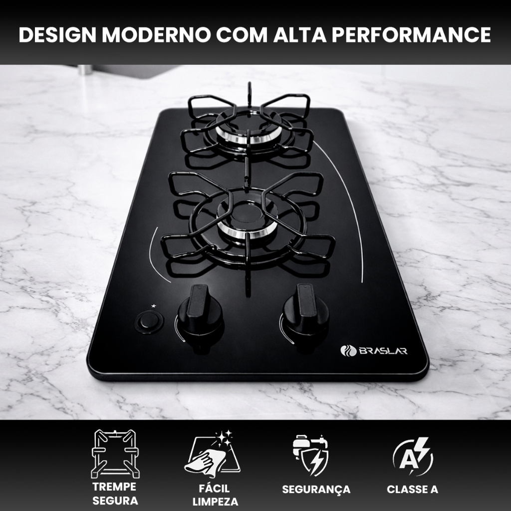 Fogão Cooktop 2 Bocas a Gás Ultra Chama 127V/220V Bivolt Acendimento Automático Vidro Braslar