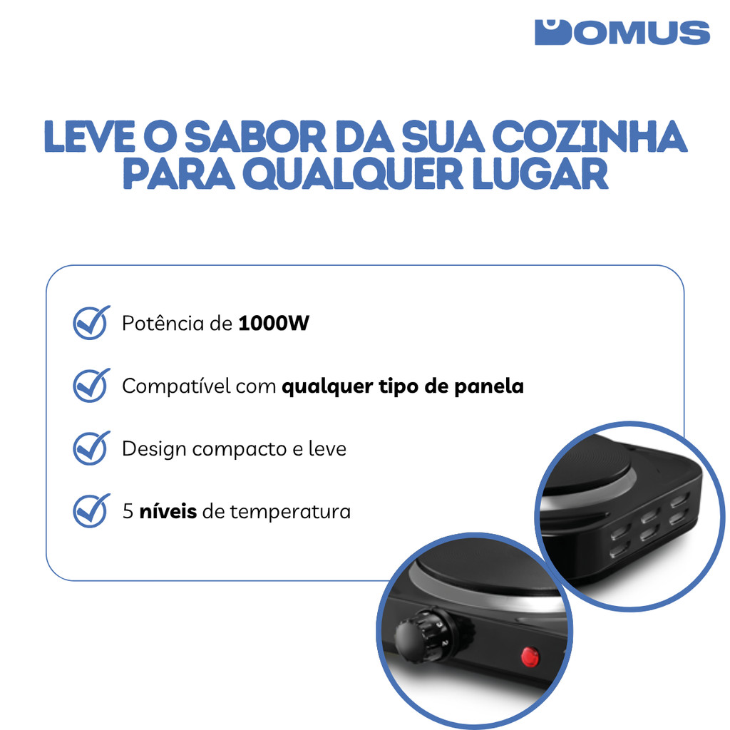 ***PRODUTO A PRONTO ENTREGA COM ENVIO IMEDIATO*** ITEM ORIGINAL COM NOTA FISCAL Somos a Domus, Loja oficial da Shopee. Temos 5 anos de experiência em E-Commerce e nosso maior objetivo é garantir a satisfação dos nossos clientes! Fogão Elétrico 1 Boca 5 Temperaturas Single Cook 1000W FG01 – Elgin | Compacto, prático e eficiente: ideal para uso diário com segurança e controle de temperatura O Fogão Elétrico Single Cook FG01 da Elgin é a escolha ideal para quem busca praticidade, segurança e desempenho no preparo de refeições rápidas. Compacto e funcional, é perfeito para ambientes com pouco espaço, como cozinhas pequenas, escritórios, motorhomes, áreas de camping ou apoio em cozinhas maiores. Com 1000W de potência e controle com 5 níveis de temperatura, permite ajustar o calor conforme o tipo de preparo desejado. Sua base estável e estrutura resistente garantem segurança durante o uso, enquanto o design moderno combina com qualquer ambiente. Ideal para uso doméstico ou em situações temporárias, como viagens ou eventos, é compatível com a maioria dos tipos de panelas metálicas com fundo plano. Informações técnicas: Potência: 1000W Tensão: 127V ou 220V (consultar modelo disponível) Níveis de temperatura: 5 Diâmetro da chapa: 155 mm Estrutura: corpo metálico com pintura eletrostática Peso: 0,60 kg (aproximadamente) Cor: preto Conteúdo da embalagem: 1 Fogão Elétrico 1 Boca 1000W FG01 Elgin Manual de instruções Produto original com garantia Garantia de 12 meses pelo fabricante Solução prática e versátil para preparar alimentos em qualquer lugar, com segurança, controle de temperatura e excelente desempenho.