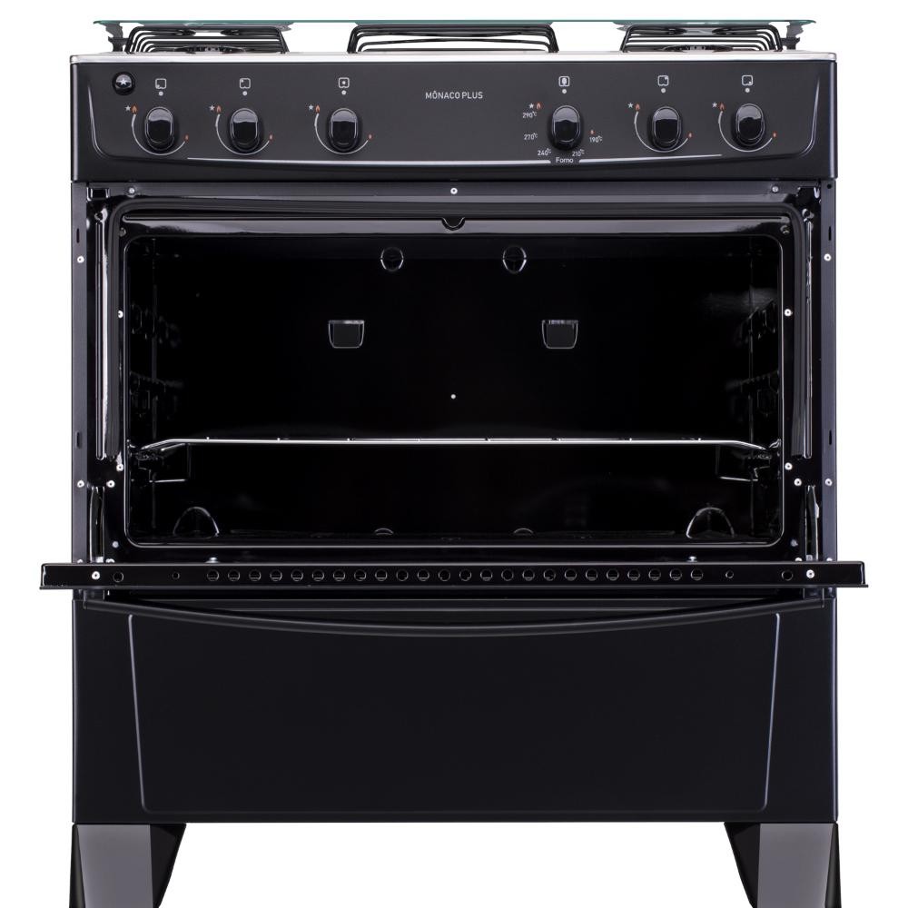 Fogão de Piso Gás 5 Bocas Mesa de Inox Tampa Vidro Forno Cozinha Moderna Atlas Mônaco Plus Preto