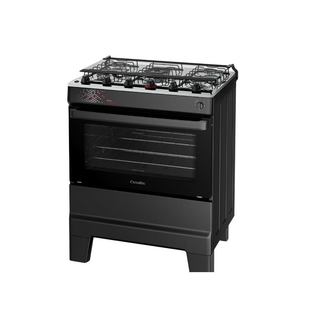 Fogão Esmaltec 5 Bocas Ideal Master Mesa Inox Tampa de Vidro Forno 84 Litros Preto T5ITP Bivolt