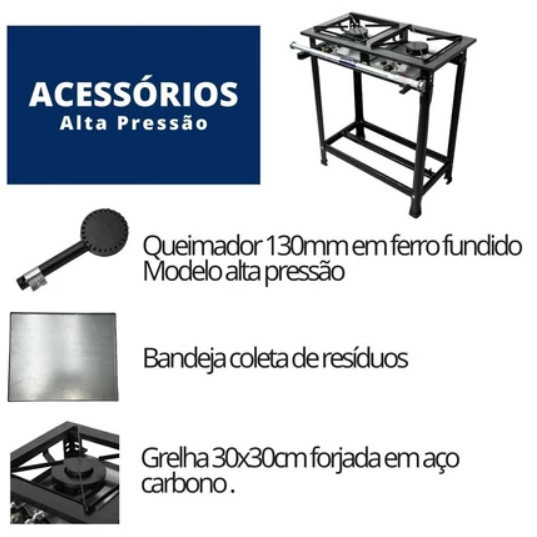 Fogão Industrial 2 Bocas Alta Pressão P5 JCN O Fogão Industrial 2 Bocas Alta Pressão P5 da JCN é ideal para bares, lanchonetes e restaurantes ou áreas de lazer, garantindo uma maior praticidade e qualidade no cozimento de grande quantidade de alimento. Os fogões industriais de alta pressão o gás sai do botijão direto para o queimador, sem passar por um regulador, isso faz com que as chamas do alta pressão sejam mais intensas. O fogão industrial de alta pressão é recomendado para produção de grande quantidade de alimentos e para frituras. Conheça melhor o Fogão Industrial 2 Bocas Alta Pressão P5 da JCN Especificações Técnicas Material da Estrutura: Chapa de Aço Carbono Material do Registro Regulador de Gás: Zincado Material do Queimador: Ferro Fundido à alta temperatura Material dos Pés: Aço Carbono Desmontáveis e Sapatilhas de Borracha Antiderrapante Grelha: 30x30cm contendo 4 dedos em Aço Carbono Mesa: Perfil 5 (50mm) Pintura: Epóxi - Preta Funcionamento: À Gás Acendimento: Manual Pressão do Gás: Alta Pressão Queimadores: 2 Queimadores Simples Consumo: 700gr/hr por queimador Observação : Este fogão somente funciona com registro de alta pressão. O uso de registro de baixa pressão vai comprometer o desempenho, deixando a chama fraca.Utilize sempre registro de alta pressão para garantir o funcionamento correto e seguro. Medidas do Produto Montado Altura: 82cm Largura: 74cm Profundidade: 49cm Peso: 16kg Garantia 3 meses contra defeito de fabricação