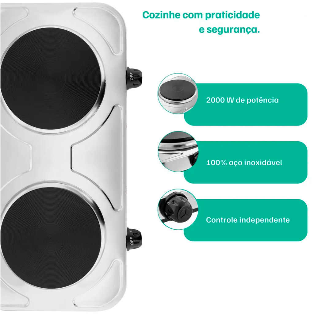 Fogareiro Elétrico Portátil Inox 2 Bocas 2000W 5 Temperaturas Good&Go Profissional 110v Ou 220v