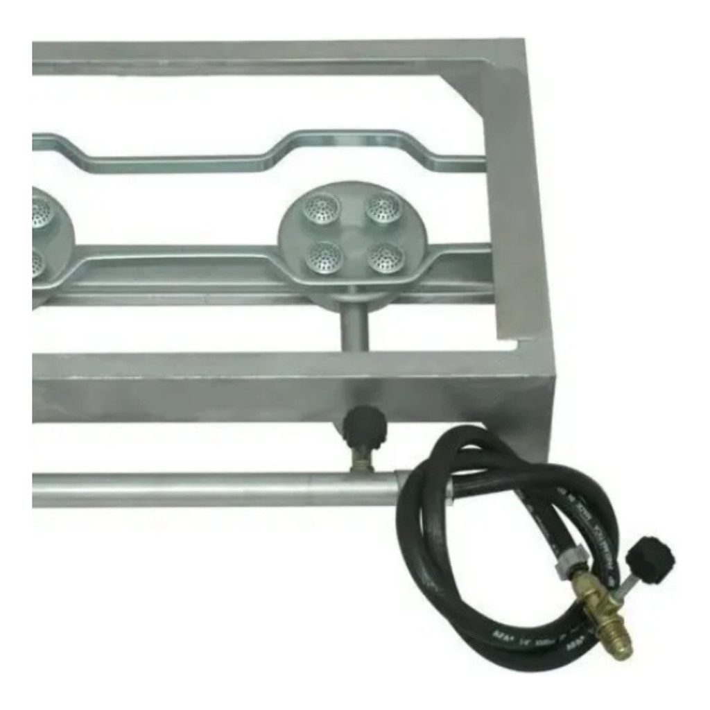 FOGAREIRO A GÁS 2 BOCAS ALUMÍNIO FUNDIDO COMPLETO CAMPING Fogareiro gás alta pressão 2 bocas em alumínio fundido alta resistência e qualidade extraordinária, fácil utilização, compacto e muito versátil. Queimadores em alumínio injetado, estrutura projetada com alumínio fundido de altíssima qualidade prolongando a vida útil do fogão e proporcionando segurança ao usuário do produto. Limpeza facilitada para deixar muito mais agradável e confortável a utilização do fogão. Grade superior de apoio de panelas em aço galvanizado. Saída mangueira gás fogareiro lado esquerdo. MEDIDAS: Comprimento: 43 cm Largura: 28 cm Altura: 8 cm Peso: 2,1kg CARACTERÍSTICAS DO PRODUTO: 1 Fogão completo 1 metro de mangueira 1 registro de borboleta que é ligado ao botijão 2 registros de regulagem que regula a altura da chama 1 Grade de apoio para panelas