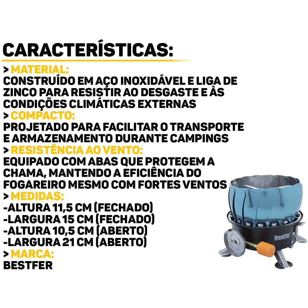 Fogareiro Portátil Para-Brisa Bestfer ** NÃO ACOMPANHA O GÁS ** O Fogareiro Portátil Para-Brisa Bestfer é uma excelente opção para quem busca praticidade e eficiência em suas atividades ao ar livre. Produzido em aço e liga de zinco, suporta altas temperaturas e condições externas adversas. O para-brisa embutido ajuda a proteger a chama do vento, garantindo um cozimento mais eficiente e uniforme. Características: > Indicado para camping e outras atividades ao ar livre; > Ideal para aquecer alimentos e preparar refeições em ambientes externos; > A estrutura é projetada para facilitar a limpeza após o uso, evitando acumulação de resíduos. Especificações Técnicas: > Material: aço e liga de zinco; > Dimensões do produto: - Aberto: 12cm x 14,5cm x 14,5cm; - Fechado: 10cm x 20,5cm x 20,5cm. - Marca: Bestfer - Garantia: 90 dias contra defeitos de fabricação Vantagens de comprar na Brester: - Produto a pronta entrega. - Produto novo, com garantia de fábrica. - Nota fiscal para Pessoa Física e Pessoa Jurídica.