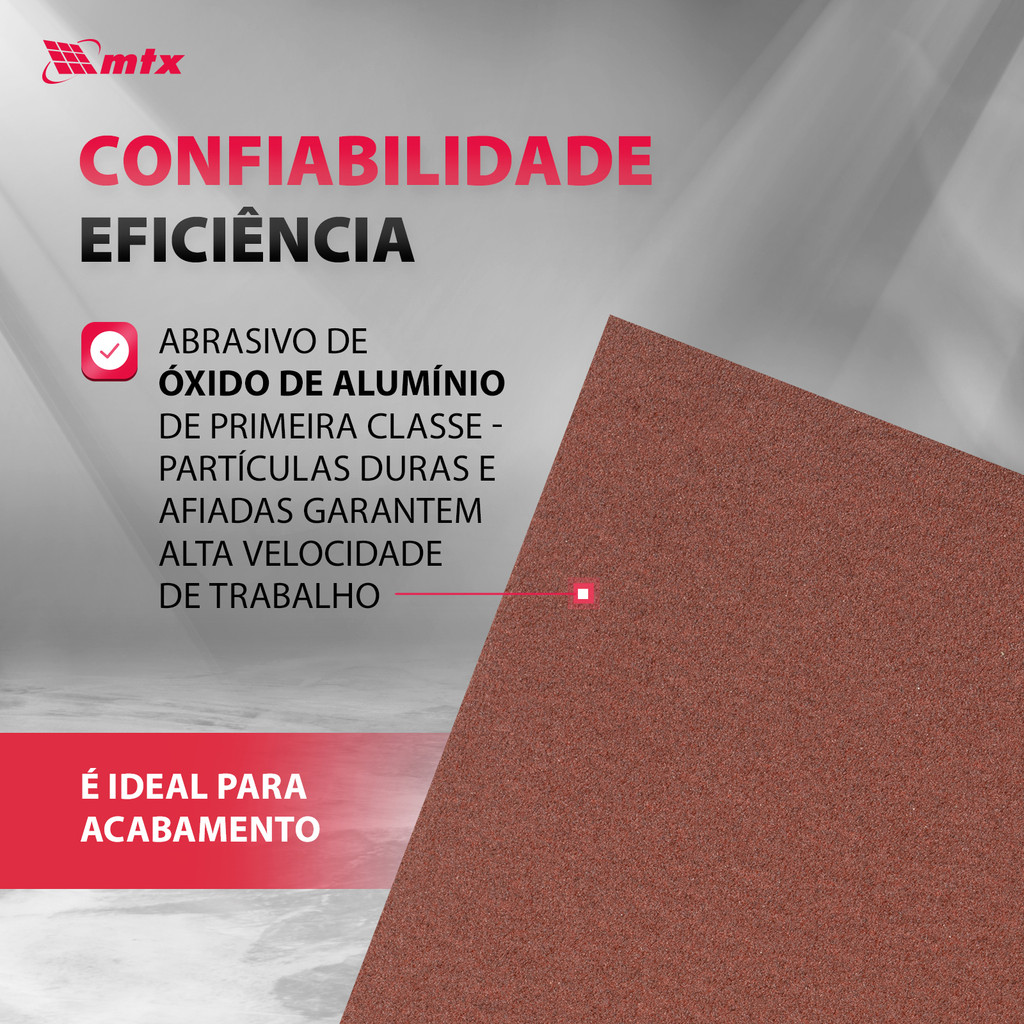 Folha de Lixa MTX P240 7561455 (230 x 280 mm) – Acabamento Fino e Preciso em Diversos Materiais A Folha de Lixa MTX 7561455, com granulação P240 e dimensões de 230 x 280 mm, é uma solução refinada para tarefas de acabamento final em madeira, metal, plástico e massa corrida. Desenvolvida com óxido de alumínio (corindo eletrofundido), esta folha oferece uma ação abrasiva eficiente para a remoção de camadas finas de esmalte, verniz, tinta, ferrugem e sujeira, preparando as superfícies com alto grau de uniformidade. Compatível com lixamento manual e máquinas planas, destaca-se por sua flexibilidade e adaptabilidade. Vantagens Versatilidade Incomparável Compatível com madeira, metal, plástico e massa corrida. Ideal para uso em lixamento manual, máquinas planas ou outros dispositivos. Acabamento de Alta Qualidade Granulação P240 ideal para o acabamento final de superfícies, promovendo um aspecto liso e preparado para pintura, verniz ou esmalte. Remove imperfeições finas com precisão. Alto Desempenho Abrasivo Grãos de óxido de alumínio com corte eficiente e controlado, proporcionando alta taxa de remoção sem agredir o material base. Otimiza o tempo de execução com resultados consistentes. Conformidade com Superfícies Irregulares Base em papel flexível que permite adaptação a contornos e áreas curvas, proporcionando um lixamento uniforme mesmo em superfícies não planas. Lixamento Seco ou Úmido Estrutura resistente à água, possibilitando o uso em lixamento úmido para reduzir o calor e prolongar a vida útil da lixa. Pacote Econômico e Funcional Embalagem com 10 unidades, ideal para projetos contínuos ou de maior escala, com fácil armazenamento e organização. Especificações Técnicas Modelo: Folha de Lixa MTX 7561455 Dimensões: 230 x 280 mm Granulação: P240 Abrasivo: Óxido de alumínio (corindo eletrofundido) Costado: Papel flexível Lixamento: Seco e úmido Tipo de Uso: Manual ou com máquinas de lixamento planas Quantidade: 10 unidades