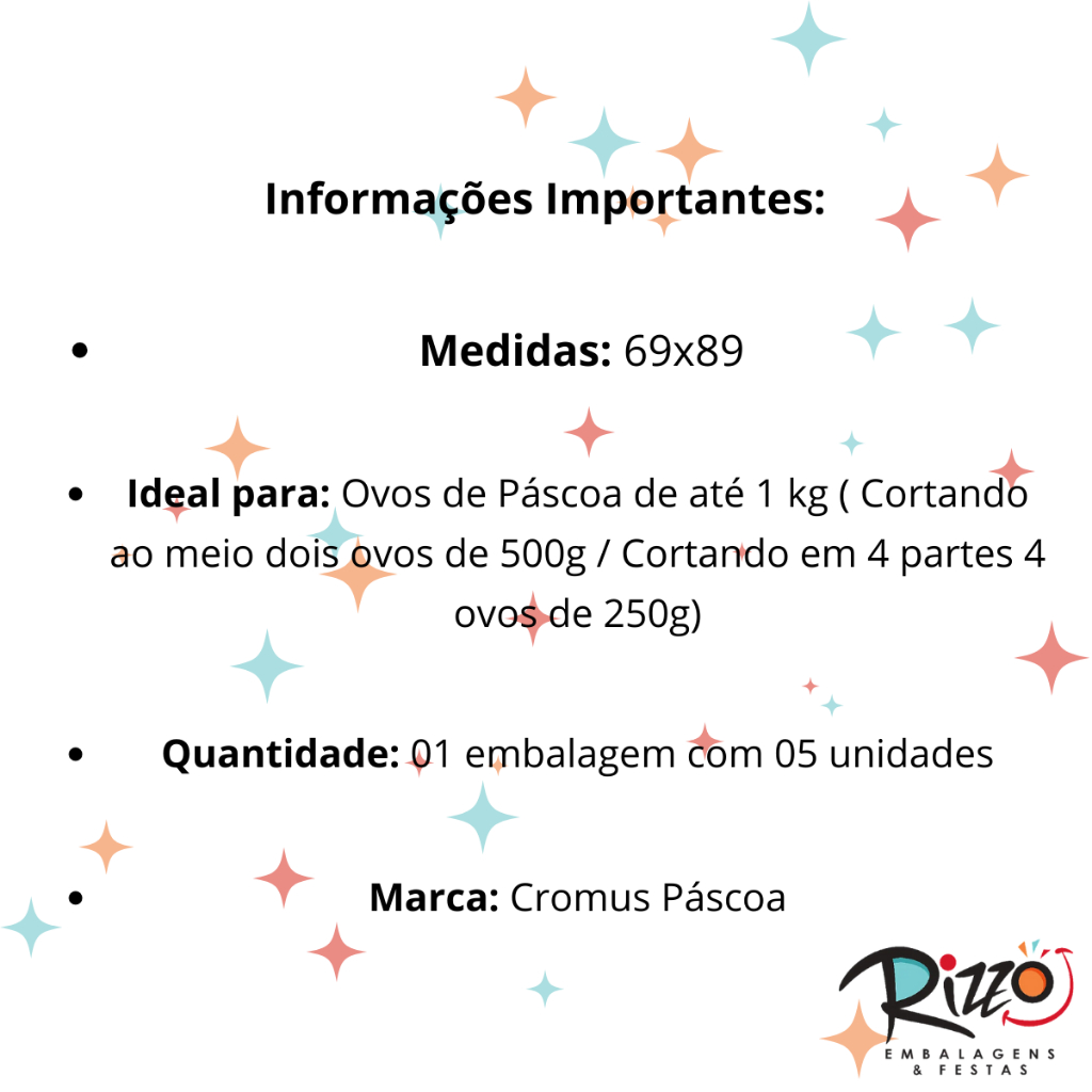 Folha para Ovos de Páscoa Papel Kraft Sweet Vermelho 69x89cm - 5 unidades - Cromus - Rizzo Distribuidora Descubra a magia da Páscoa com a Folha para Ovos de Páscoa 69x89 cm da Cromus, disponíveis na Rizzo Distribuidora. Surpreenda seus convidados com uma decoração encantadora e cheia de personalidade. Nossas folhas foram cuidadosamente projetados para embalar seus deliciosos ovos de Páscoa com praticidade e estilo. Celebre a Páscoa com praticidade e sofisticação. Escolha a Folha para Ovos de Páscoa da Cromus e garanta uma embalagem perfeita para seus ovos de Páscoa. Descrição Técnica: Produto: Folha para Ovos Cor: Sweet Vermelho Modelo: Para ovos de até 1kg / Cortando ao meio dois ovos de 500g / Cortando em 4 partes 4 ovos de 250g Composição: Papel Kraft Tamanho: 69 x 89 cm Quantidade: 05 unidades Marca: Cromus Páscoa ATENÇÃO: Não acompanha laço!! Duvidas Frequentes: Quanto tempo leva o envio?⏰ Todos os pedidos com etiqueta de envio liberado pela shopee até as 18hs são coletados no próximo dia útil pela transportadora Shopee Xpress. Qual o prazo de entrega?🛵 A loja não tem acesso a parte logística da shopee. A Shopee não informa para a loja prazo de entrega. Ao clicar em comprar na opção envios é apresentado o prazo de entrega. O produto é novo?📦 Sim. Só trabalhamos com produto novos e dentro da embalagem original do fabricante. Como faço para comprar mais de um item da loja? No app ao lado do botão comprar tem o ícone de um carrinho de supermercado, clicando nele o produto será acrescentado no carrinho que fica na parte superior do app. Após acrescentar todos os produtos que gostaria é só clicar no carrinho e selecionar todos os itens e clicar em continuar. Na Rizzo Distribuidora, a tradição e o encanto do nosso espaço físico no coração da 25 de março, em São Paulo, são cuidadosamente embalados para chegar até você. Permita-nos levar a magia de uma das lojas mais tradicionais da região diretamente para o conforto da sua casa ou empresa. #pascoa #rizzo #festa #sacoexpress #sacosparapascoa #embalagemdeovodepascoa