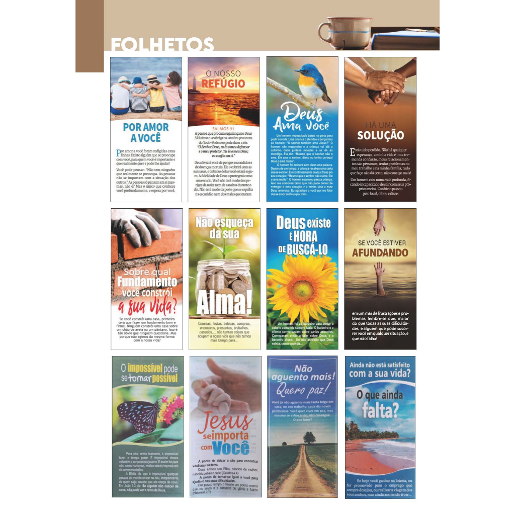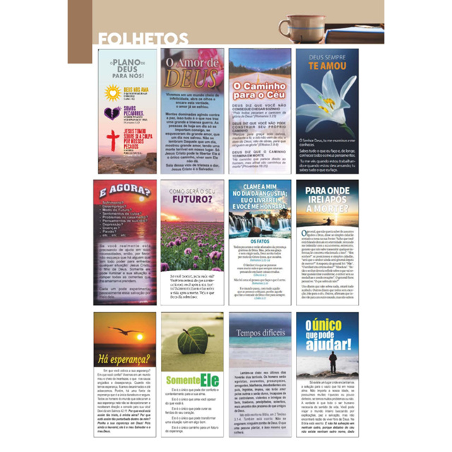 | Folhetos Evangelísticos Variados - Caixa com 10 mil ud este produto | R$ 155,00 | — | 4.9/5 | 5 |