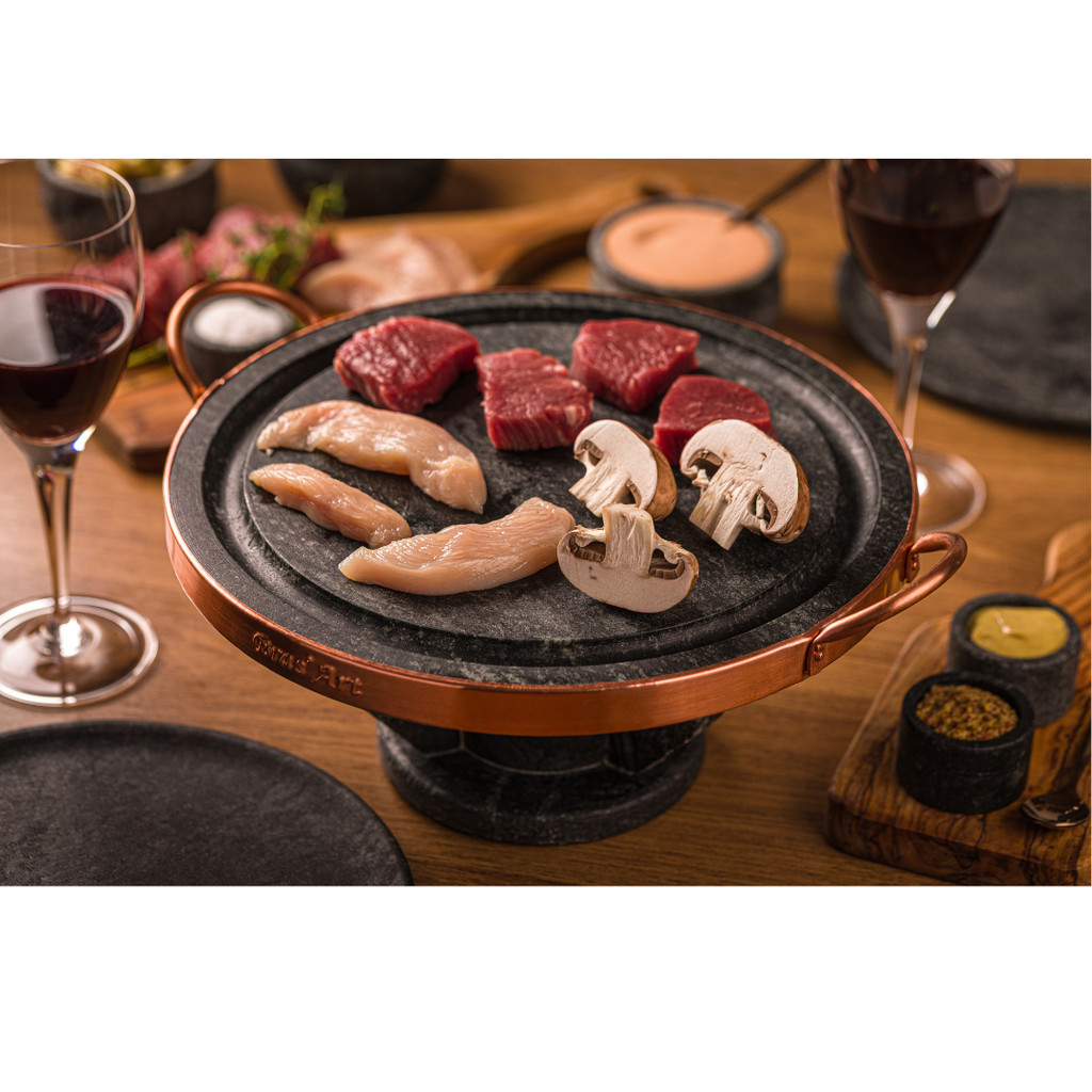 Fondue Natural Bras Art – A escolha ideal para momentos especiais com sabor e tradição! Este fondue em pedra sabão é uma peça única e artesanal, feita 100% com pedra sabão, uma rocha natural e livre de metais pesados. Ele oferece retenção de calor excepcional e distribuição uniforme, mantendo as carnes no ponto perfeito, sem perder o sabor ou a suculência. Com seu design polido e superfície antiaderente natural, este fondue combina funcionalidade e estilo, tornando-o ideal para encontros aconchegantes e duradouros Acompanha: Grelha com Alças e contorno de cobre, metal nobre fixos na grelha, Fogareiro 1 queimador e 1 tampinha para apagar a chama ao finalizar Especificações da grelha de Fondue: Matéria-prima: Pedra Sabão, nome científico: Esteatita Espessura: 2 cm Diâmetro externo: 37 cm Especificações do réchaud de Fondue 1 queimador: Matéria-prima: Pedra Sabão, nome científico: Esteatita Altura: 11 cm Diâmetro: 19 cm Peso: 8 kg (completa) OBS: O fondue de pedra por ser natural e 100% artesanal pode incluir variações em seu processo de fabricação, incluindo: o formato e medidas. Tanto um pouco para mais ou um pouco para menos A pedra sabão por ser um produto natural possui veios naturais, que está presente em 95% da rocha, sendo uma característica comum da pedra sabão, sendo somente estética isso não afetara na durabilidade e nem na funcionalidade do Fondue O que pode ser preparado no Fondue de pedra sabão? Carnes variadas (Bovina, suína, Frango) Peixes Vegetais grelhados (Pimentões, cebolas, brócolis, cogumelos) Queijos Use o fondue de pedra sabão como uma peça versátil, explorando novas combinações. Como Utilizar: Adicione álcool líquido, em gel ou pastilhas, recomendamos o álcool com o teor acima de 70%, assim que você colocar o álcool desejado no recipiente do réchaud acenda-o com um fósforo ou isqueiro e pronto agora é só usar posicionando a chapa sobre a base do fogareiro Benefícios do Fondue de pedra sabão: Libera: Ferro, Cálcio, Magnésio e Manganês Antiaderente natural (sem teflon ou produtos químicos) Não libera toxinas – uma escolha saudável para toda a família. Instruções de limpeza do seu Fondue de pedra sabão: A limpeza é prática e fácil devido à superfície antiaderente natural – basta usar água, sabão ou detergente e uma esponja de sua preferência. Observação: Enviamos o Fondue na tonalidade natural da pedra, em cinza claro. Isso é a certeza de que está recebendo um fondue novo que nunca foi utilizado. Cada Fondue acompanha um manual impresso com o processo de cura, que é rápido e simples de fazer. Após a cura, o fondue ficará permanentemente escuro, como mostrado nas imagens do anúncio. Disponibilidade: Pronta entrega com entrega imediata. Aproveite a fabricação própria e preço justo da Bras Art! O melhor do fondue de pedra sabão está aqui – empresa familiar com história, qualidade e benefícios para sua cozinha!